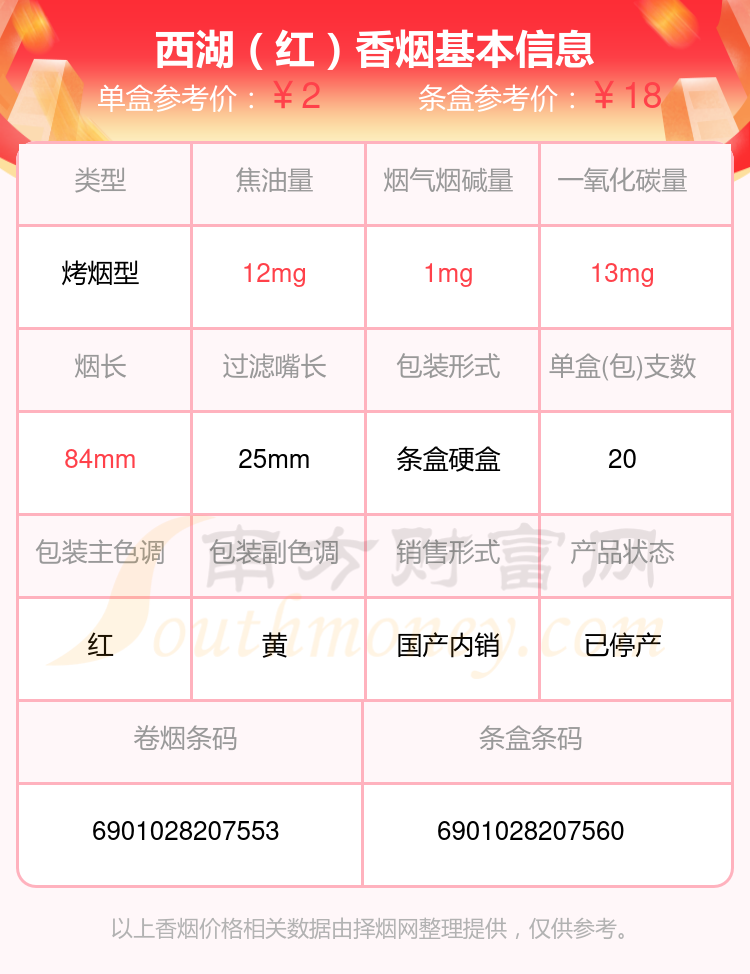 西湖牌是杭州卷煙廠早期品牌,2007年因品牌整合停產(chǎn)。