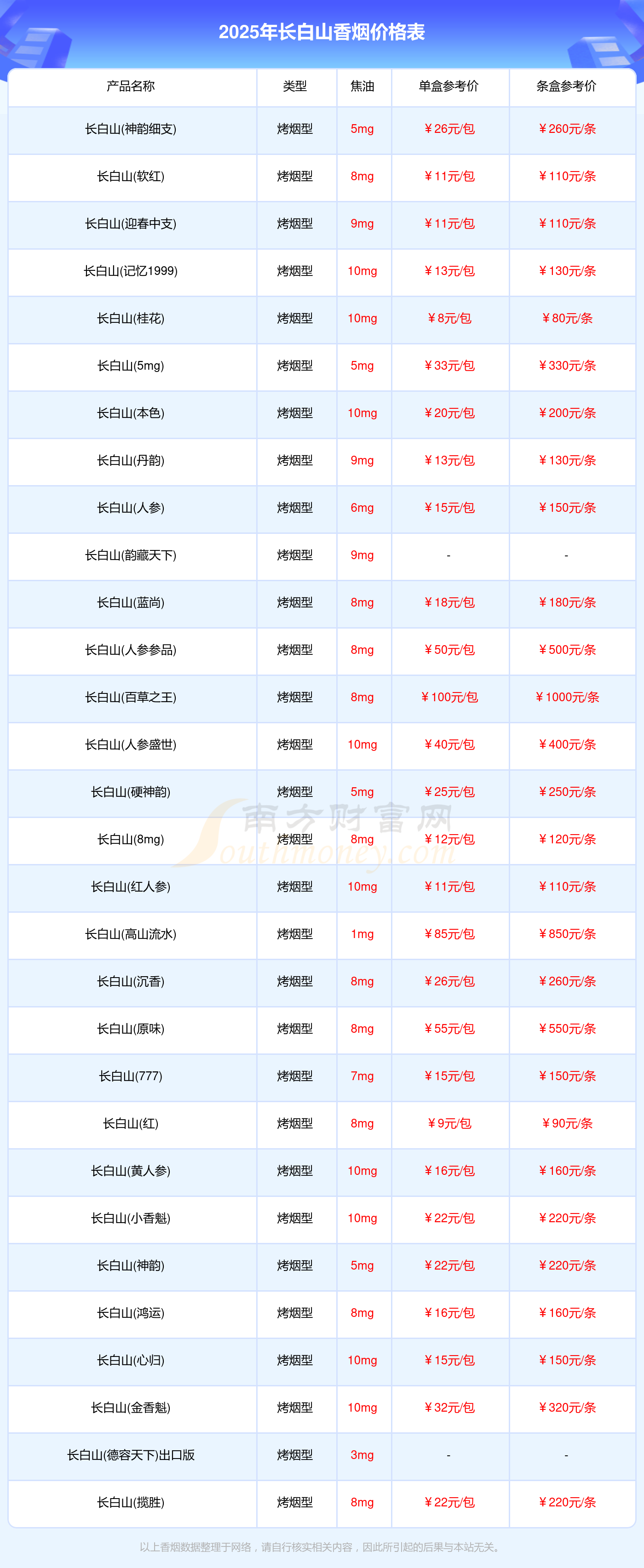 長白山香煙最新價格2025: