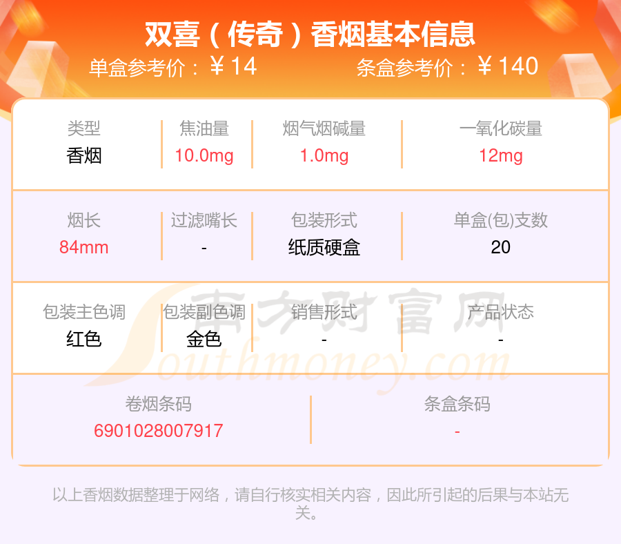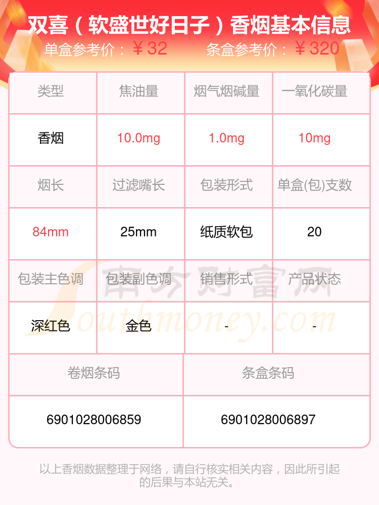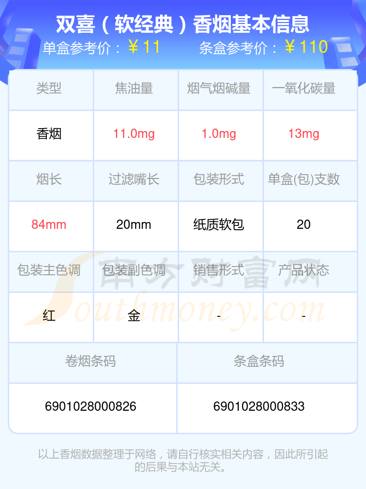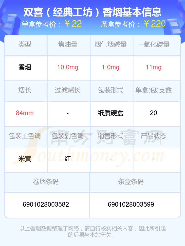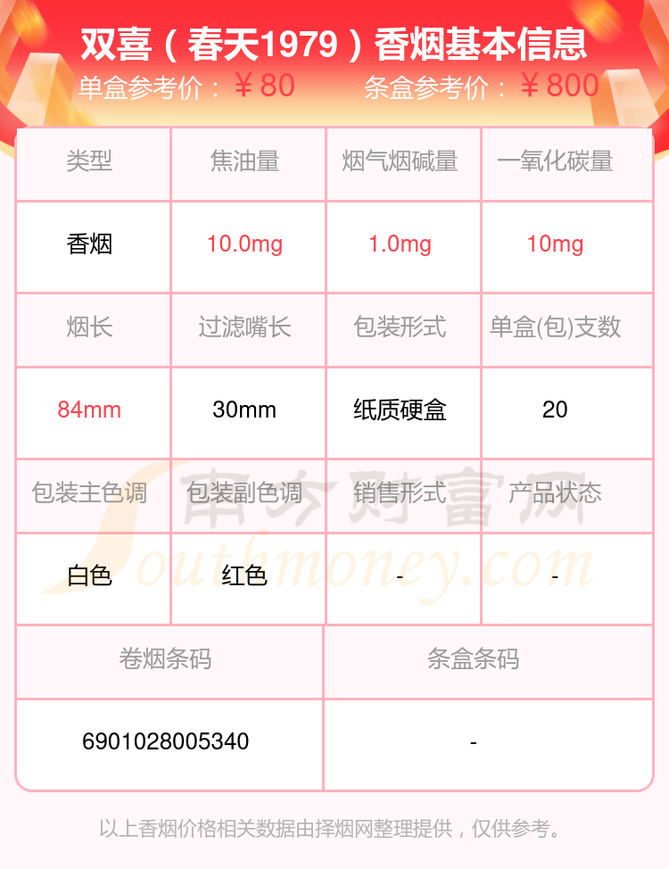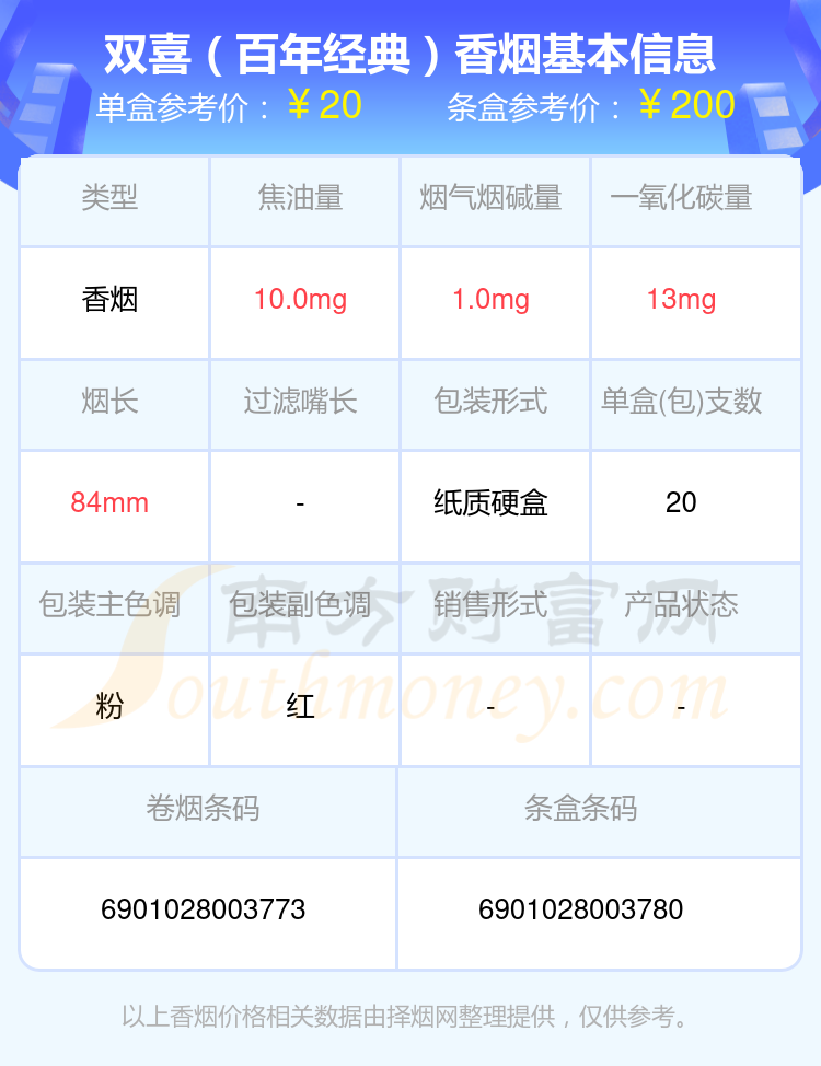 雙喜(軟經(jīng)典1906)參考價(jià)16.0元/包、雙喜(沉香)參考價(jià)100.0元/包、雙喜(軟盛世好日子)參考價(jià)32.0元/包、雙喜(硬紫紅玫王)參考價(jià)24.0元/包、雙喜(龍)參考價(jià)20.0元/包、雙喜(傳奇)參考價(jià)14.0元/包、雙喜(春天1979)參考價(jià)80.0元/包、雙喜(軟經(jīng)典)參考價(jià)11.0元/包、雙喜(百年經(jīng)典)參考價(jià)20.0元/包、雙喜(經(jīng)典工坊)參考價(jià)22.0元/包等。