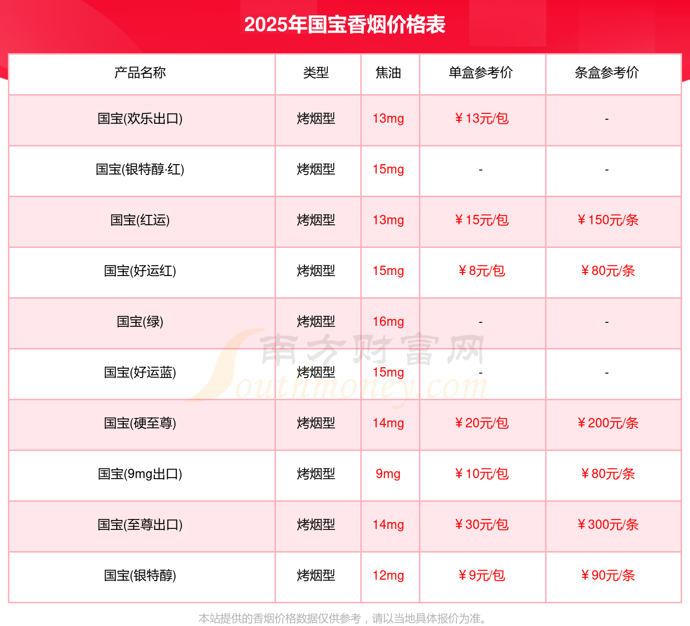 2025年,國(guó)寶(至尊出口)、國(guó)寶(硬至尊)、國(guó)寶(紅運(yùn))等國(guó)寶香煙價(jià)格如下: