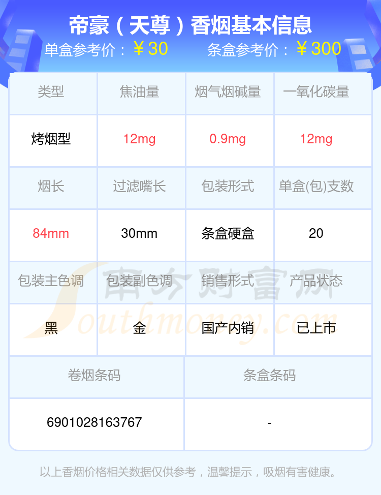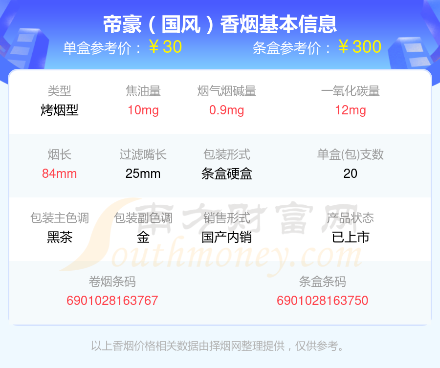 擇煙網(wǎng)為大家盤點(diǎn)了三十元至七十元左右的帝豪香煙,有帝豪(天尊)、帝豪(國風(fēng))等,詳細(xì)價(jià)格如下: