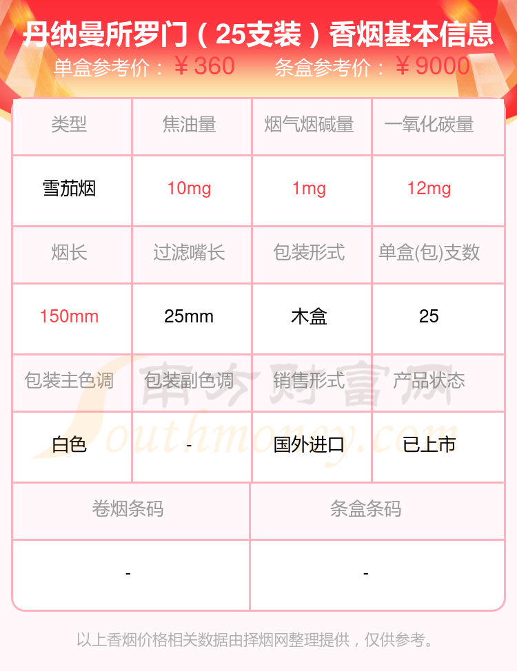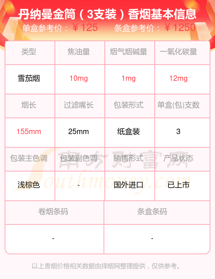丹納曼所羅門(25支裝)參考價(jià)360元/包、丹納曼金筒(3支裝)參考價(jià)125元/包等。