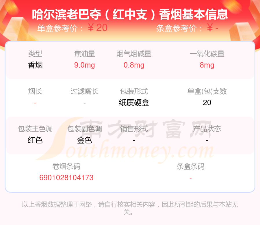 哈爾濱老巴奪(紅中支)單盒參考價(jià):20元