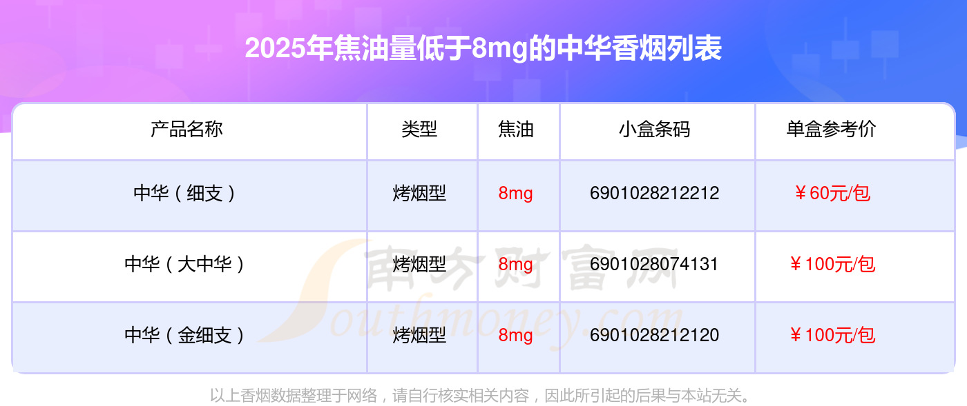 擇煙網(wǎng)為大家盤點(diǎn)了中華香煙焦油量低于8mg的,分別有中華(細(xì)支)、中華(大中華)、中華(金細(xì)支)等,詳細(xì)價(jià)格如下: