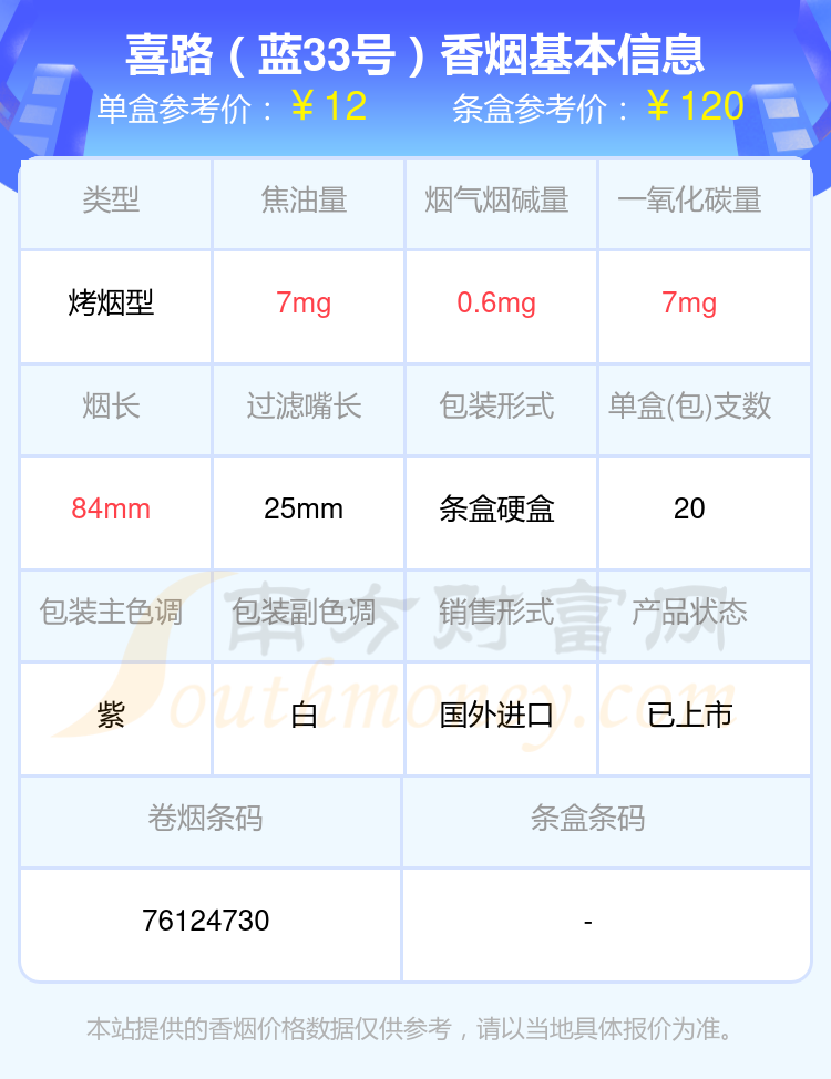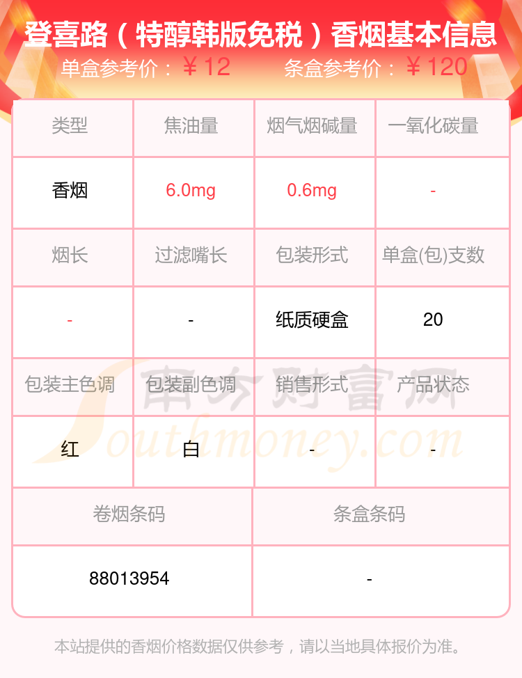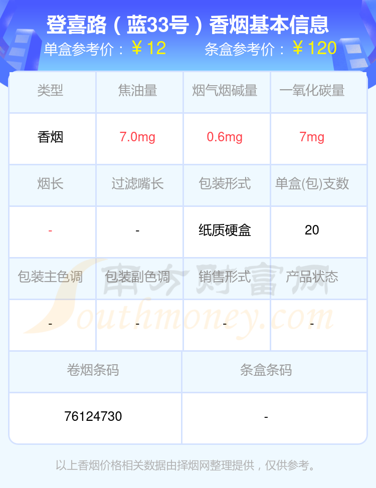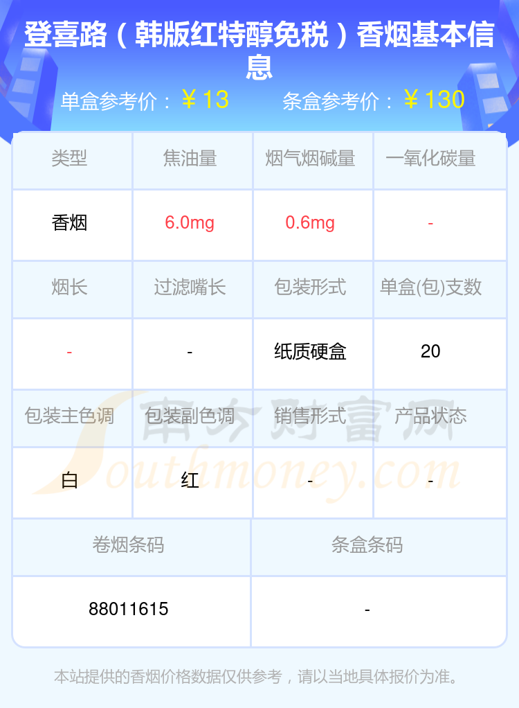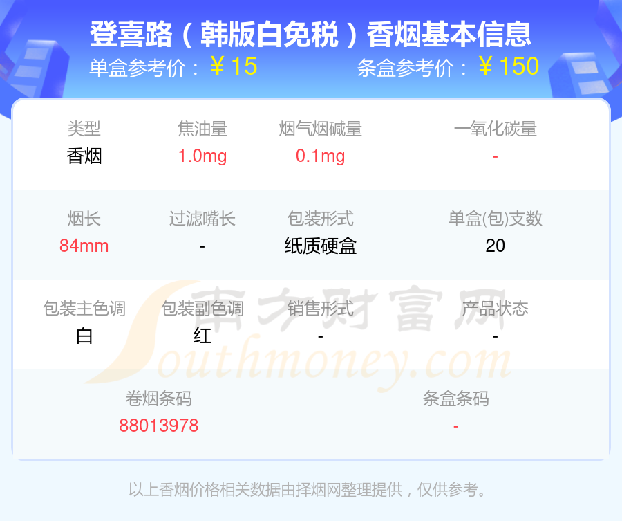 以上香煙價格相關(guān)數(shù)據(jù)僅供參考,溫馨提示,吸煙有害健康。