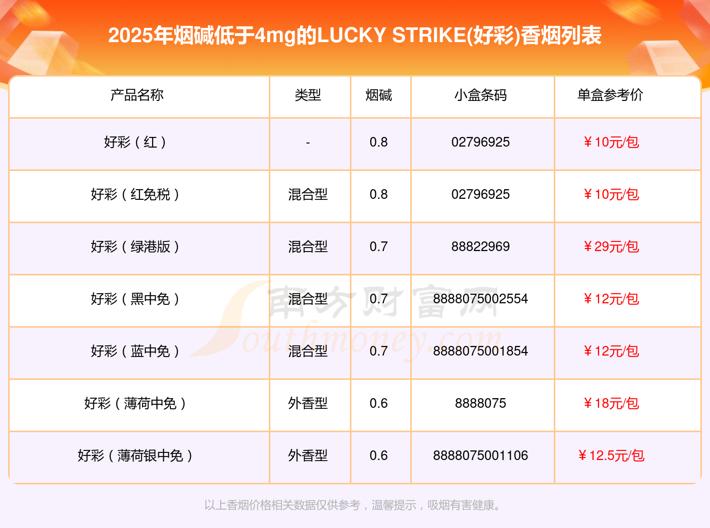 煙堿低于4mg的LUCKY STRIKE(好彩)香煙有哪些?擇煙網(wǎng)為大家整理盤點,分別有: