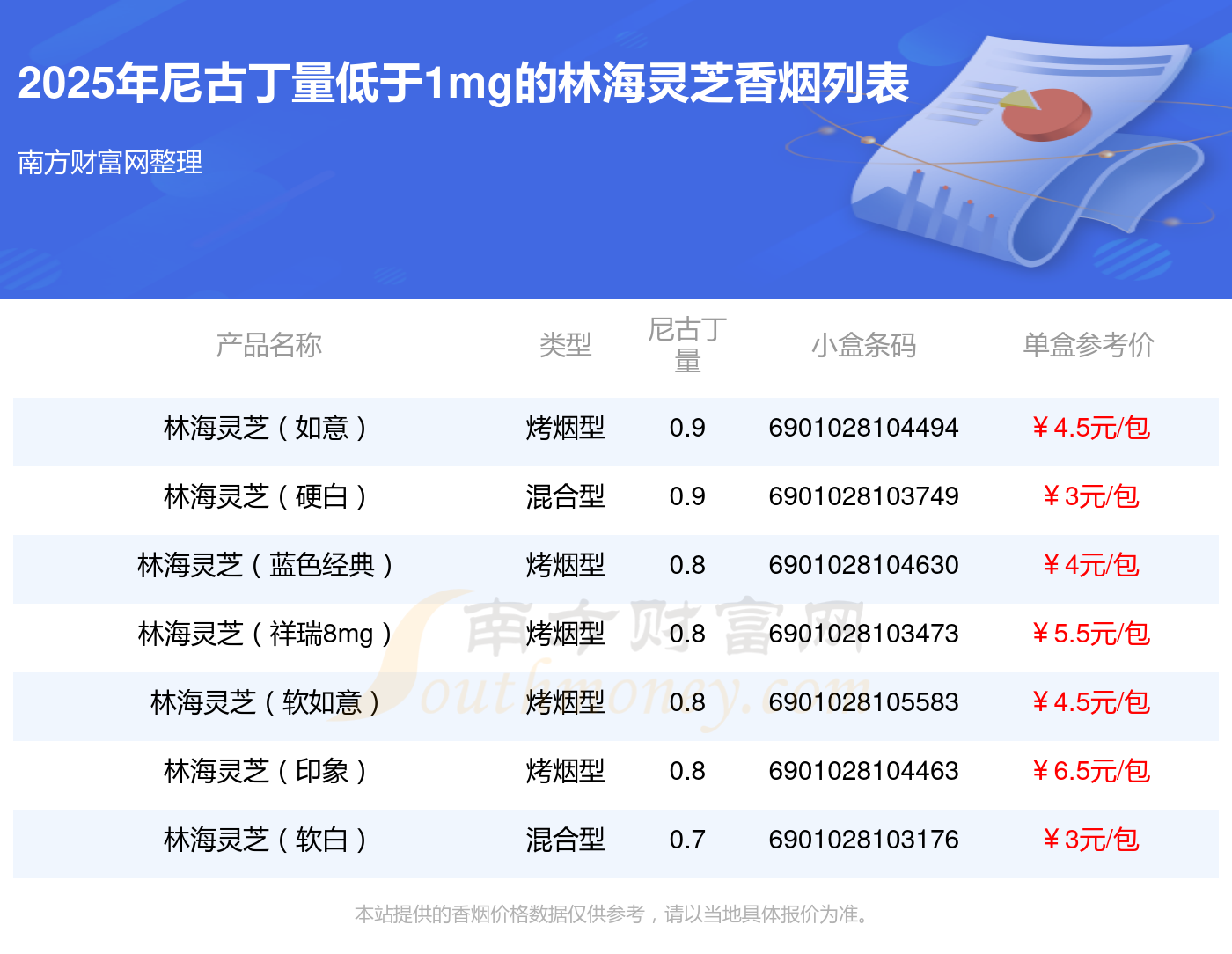 林海靈芝香煙尼古丁量低于1mg的煙有哪些?擇煙網為大家整理提供,分別有:林海靈芝(如意)、林海靈芝(硬白)、林海靈芝(藍色經典)、林海靈芝(祥瑞8mg)、林海靈芝(軟如意)、林海靈芝(印象)、林海靈芝(軟白)等,具體價格如下: