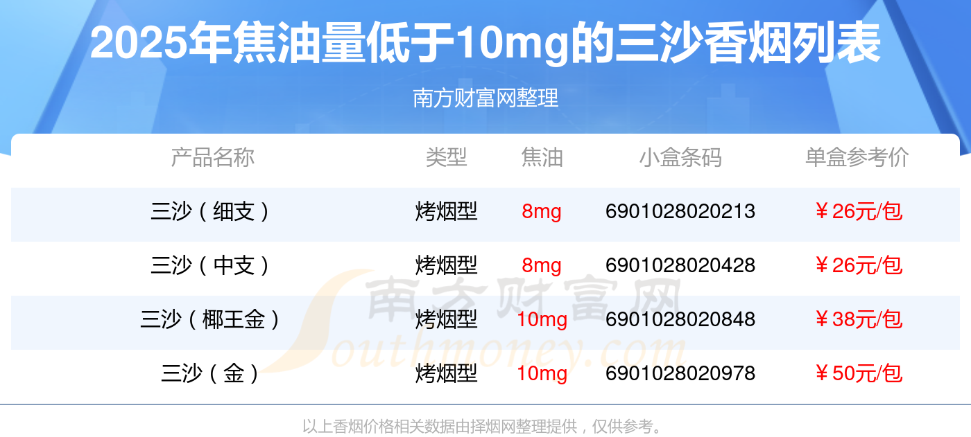 三沙(細(xì)支)參考價(jià)26.0元/包、三沙(中支)參考價(jià)26.0元/包、三沙(椰王金)參考價(jià)38.0元/包、三沙(金)參考價(jià)50.0元/包等。