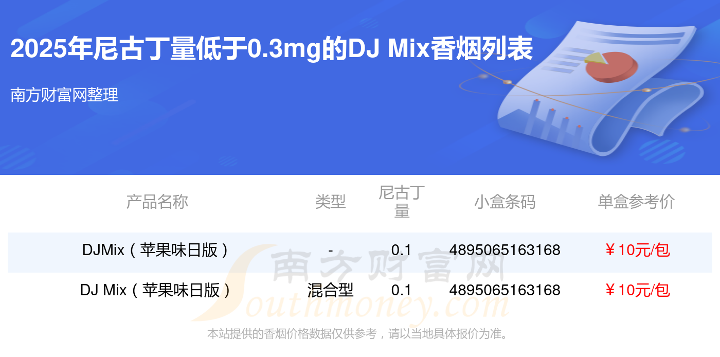 DJ Mix香煙尼古丁量低于0.3mg的煙有DJMix(蘋果味日版)、DJ Mix(蘋果味日版)等,詳細(xì)價(jià)格如下: