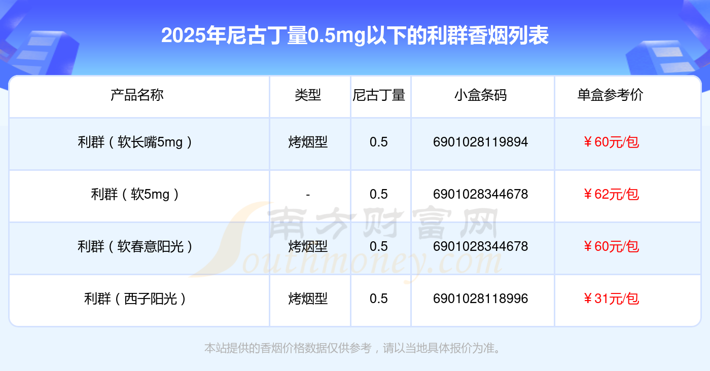 擇煙網(wǎng)為大家盤點了尼古丁量0.5mg以下的利群香煙,分別有利群(軟長嘴5mg)、利群(軟5mg)、利群(軟春意陽光)、利群(西子陽光)等,具體價格如下:
