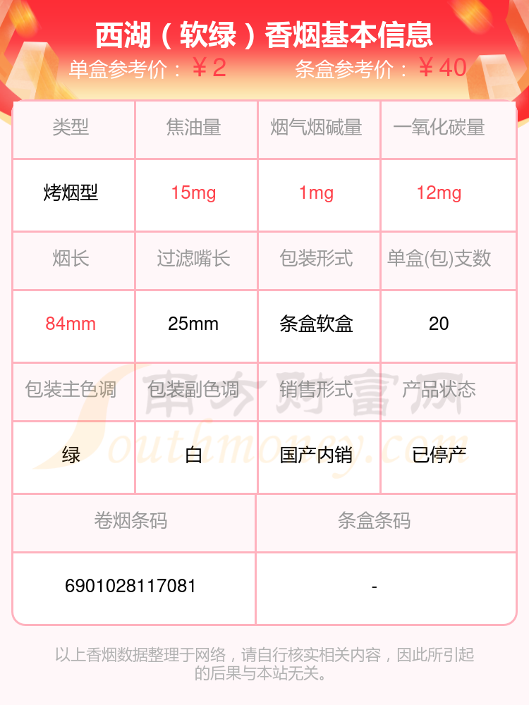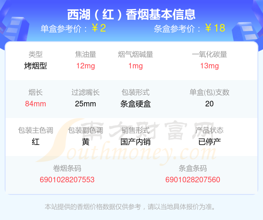 西湖牌是杭州卷煙廠早期品牌,2007年因品牌整合停產(chǎn)。