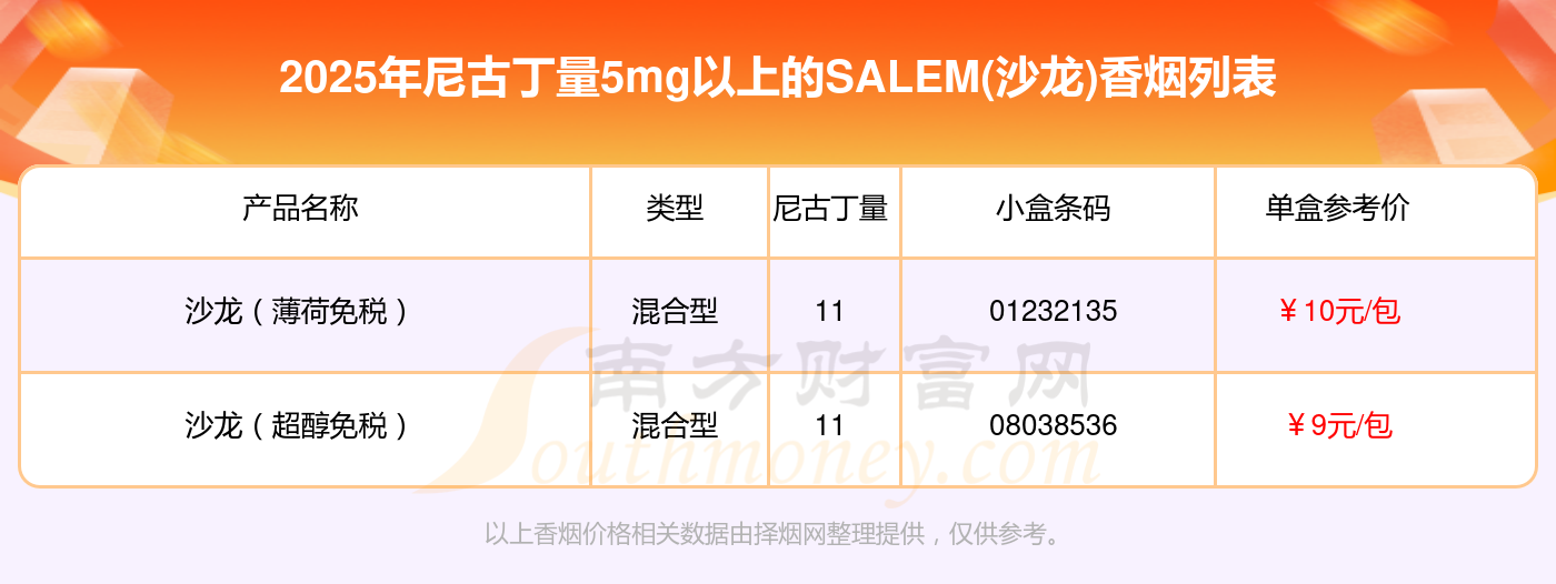 SALEM(沙龍)香煙尼古丁量5mg以上的煙有沙龍(薄荷免稅)、沙龍(超醇免稅)等,具體價格如下: