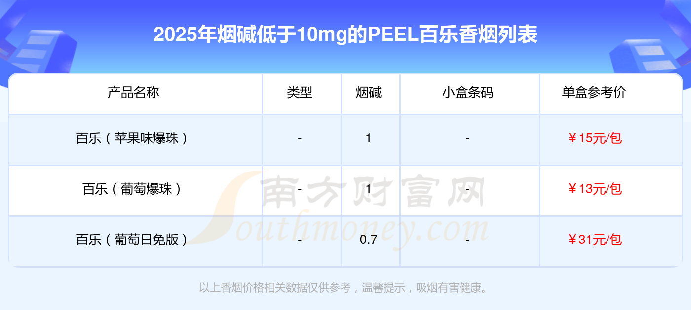 擇煙網(wǎng)為大家盤點了PEEL百樂香煙煙堿低于10mg的,分別有百樂(蘋果味爆珠)、百樂(葡萄爆珠)、百樂(葡萄日免版)等,具體價格如下: