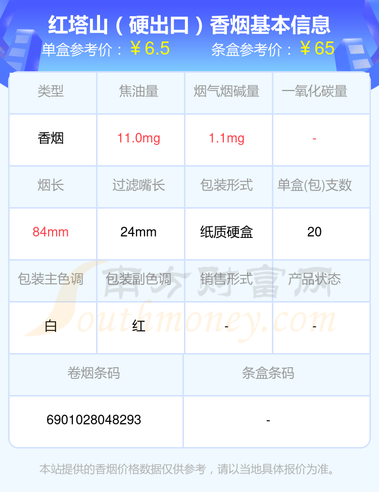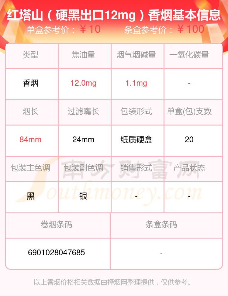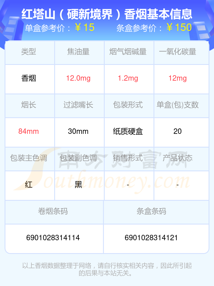 紅塔山(硬黑MY)參考價6.0元/包、紅塔山(硬新)參考價10.0元/包、紅塔山(硬人為峰)參考價20.0元/包、紅塔山(硬新境界)參考價15.0元/包、紅塔山(硬黑出口12mg)參考價10.0元/包、紅塔山(硬出口)參考價6.5元/包、紅塔山(專供出口)參考價7.0元/包、紅塔山(硬經(jīng)典)參考價10.0元/包、紅塔山(恭賀新禧)參考價14.0元/包、紅塔山(硬新勢力)參考價11.0元/包等。