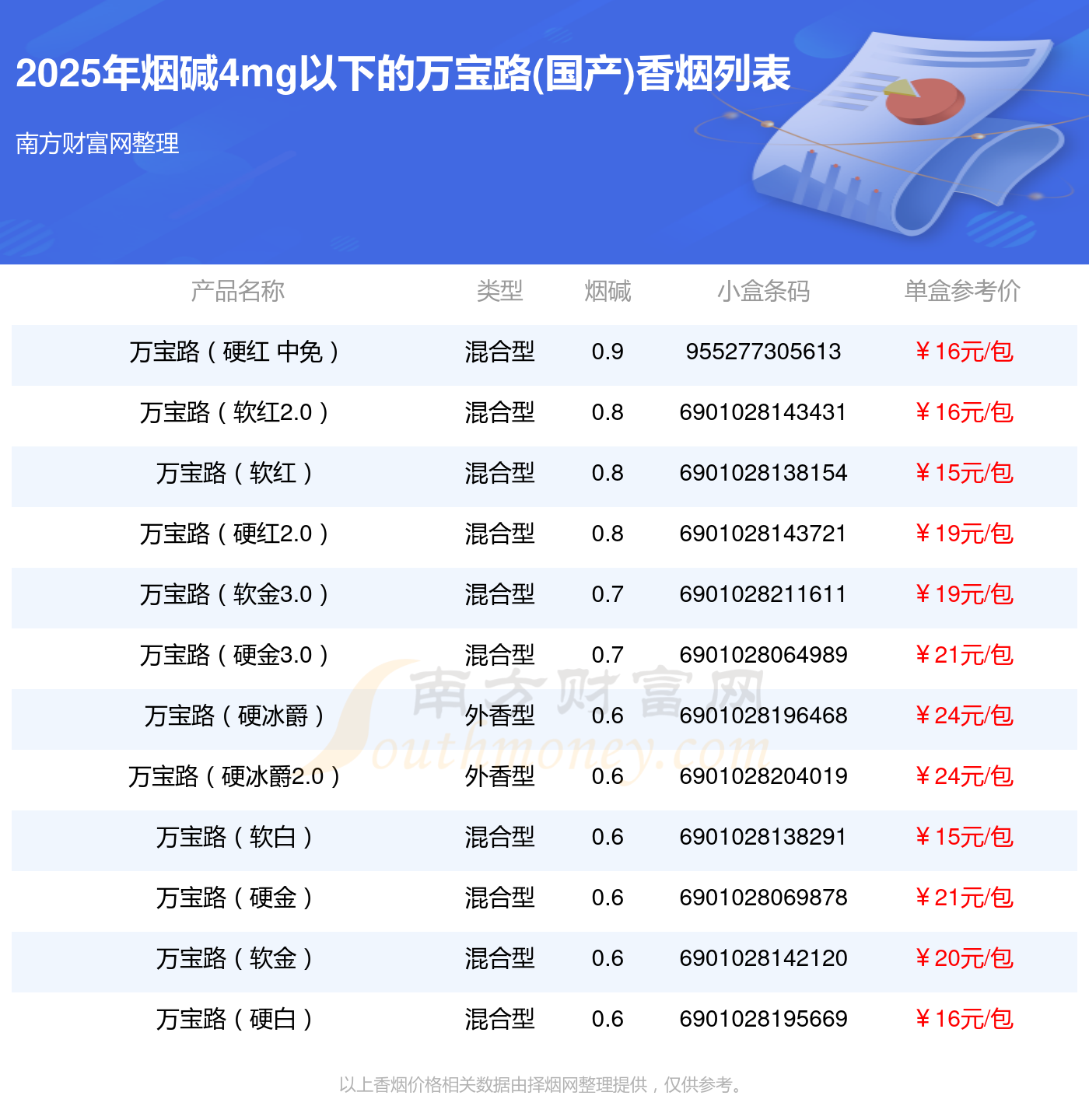 萬寶路(硬紅 中免)參考價16.0元/包、萬寶路(軟紅2.0)參考價16.0元/包、萬寶路(軟紅)參考價15.0元/包、萬寶路(硬紅2.0)參考價19.0元/包、萬寶路(軟金3.0)參考價19.0元/包、萬寶路(硬金3.0)參考價21.0元/包、萬寶路(硬冰爵)參考價24.0元/包、萬寶路(硬冰爵2.0)參考價24.0元/包、萬寶路(軟白)參考價15.0元/包、萬寶路(硬金)參考價21.0元/包等。