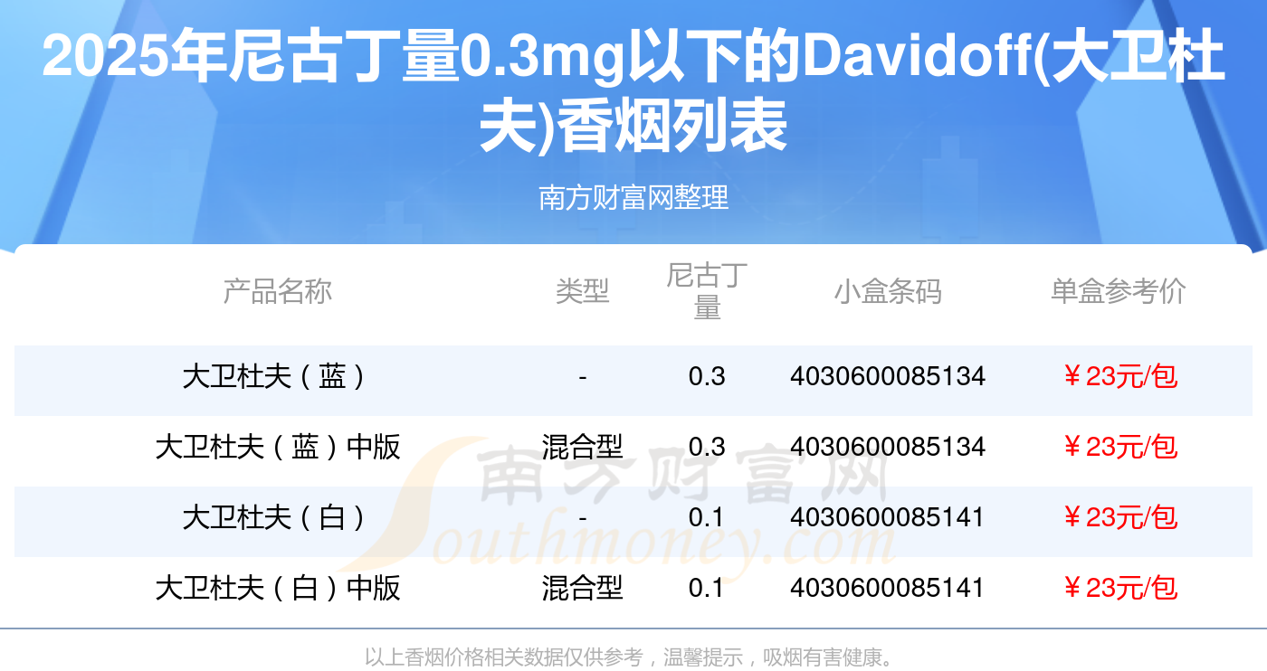 擇煙網(wǎng)為大家盤點(diǎn)了尼古丁量0.3mg以下的Davidoff(大衛(wèi)杜夫)香煙,分別有大衛(wèi)杜夫(藍(lán))、大衛(wèi)杜夫(藍(lán))中版、大衛(wèi)杜夫(白)、大衛(wèi)杜夫(白)中版等,具體價(jià)格如下: