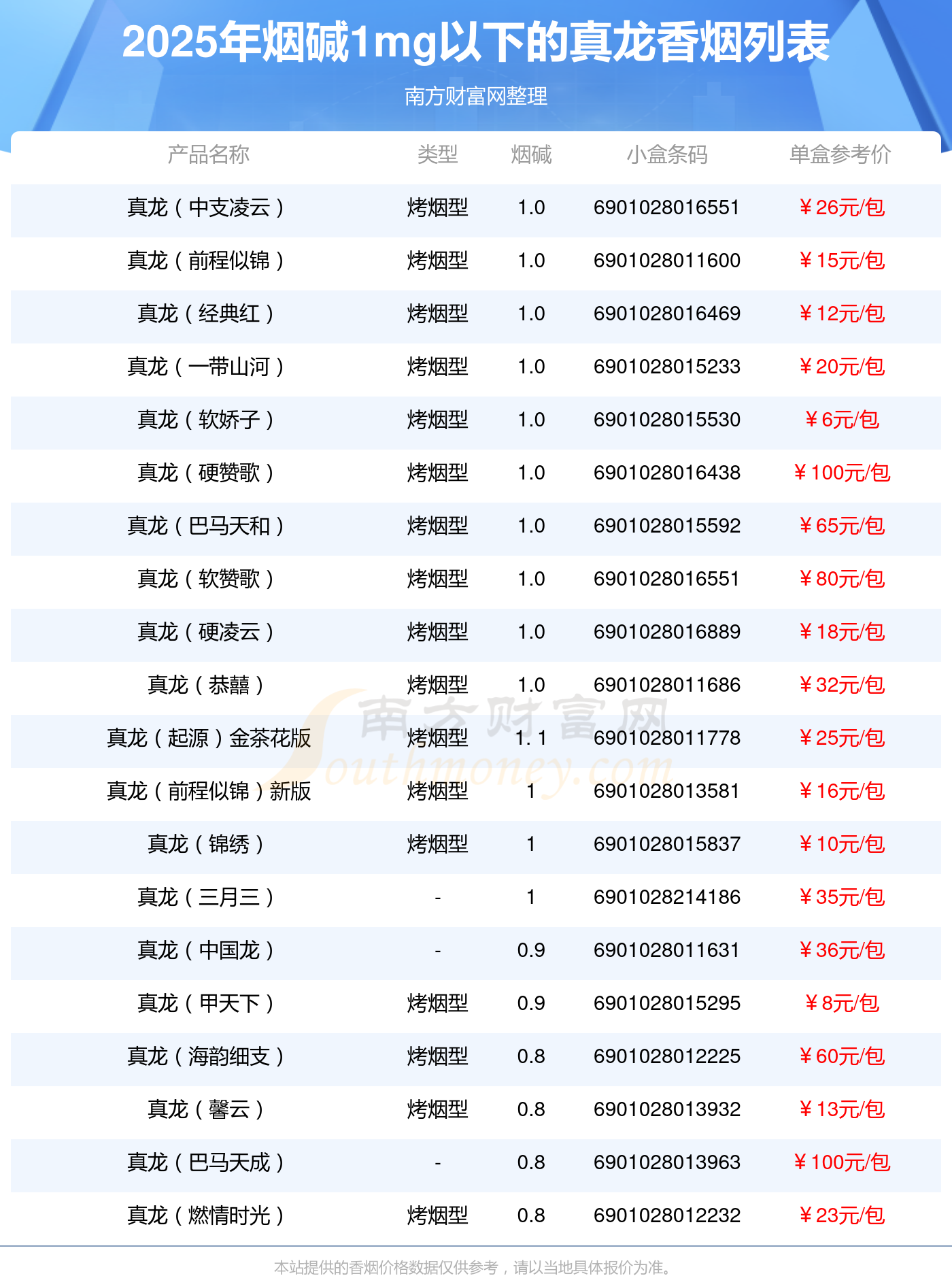 真龍香煙煙堿1mg以下的煙有哪些?擇煙網(wǎng)為大家整理提供,分別有:真龍(中支凌云)、真龍(前程似錦)、真龍(經(jīng)典紅)、真龍(一帶山河)、真龍(軟嬌子)、真龍(硬贊歌)、真龍(巴馬天和)、真龍(軟贊歌)、真龍(硬凌云)、真龍(恭囍)等,具體價(jià)格如下:
