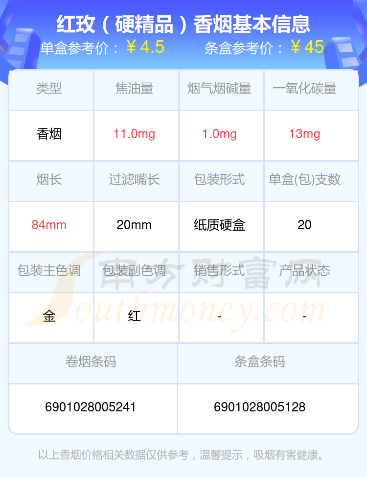 擇煙網(wǎng)為大家盤點了紅玫香煙焦油量8至15mg左右的,分別有紅玫(軟)、紅玫(硬精品)等,具體價格如下: