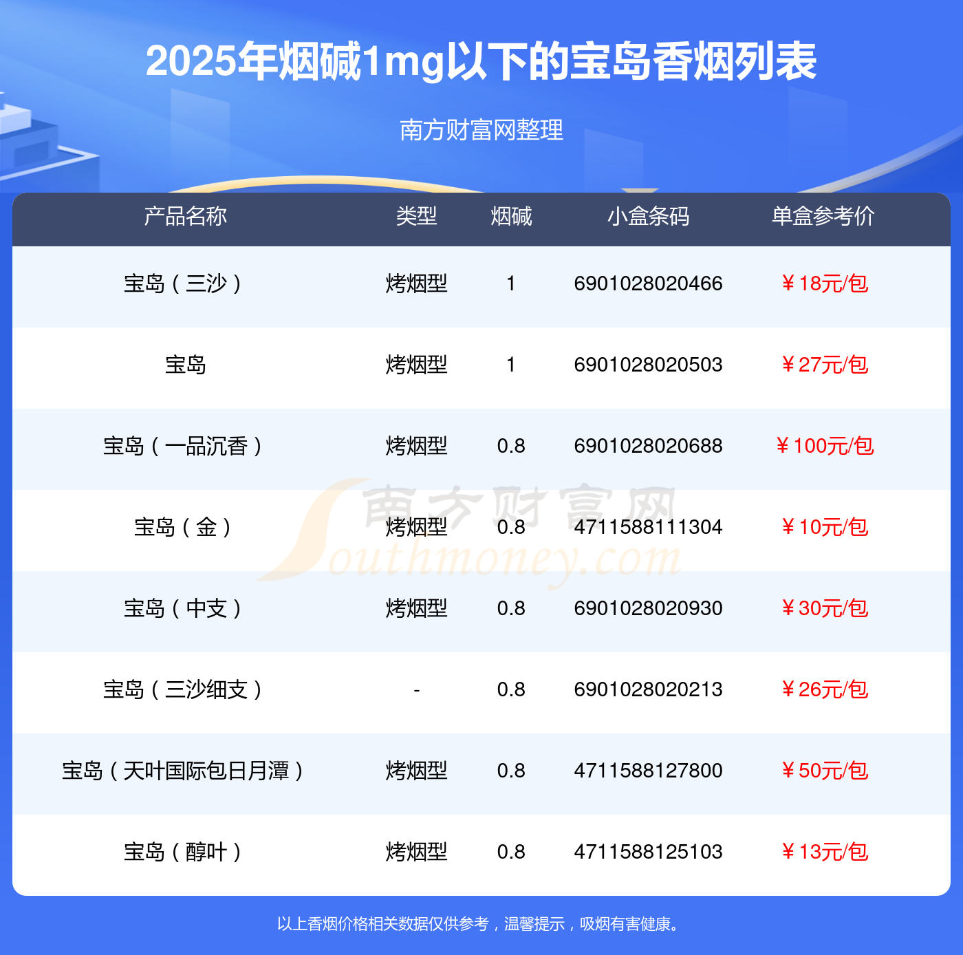 寶島香煙煙堿1mg以下的煙有寶島(三沙)、寶島、寶島(一品沉香)、寶島(金)、寶島(中支)、寶島(三沙細(xì)支)、寶島(天葉國際包日月潭)、寶島(醇葉)等,具體價(jià)格如下: