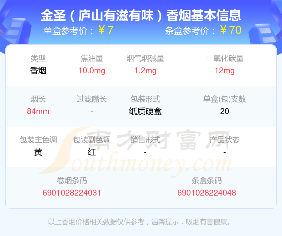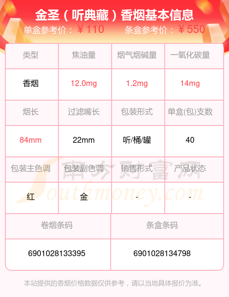 金圣(廬山有滋有味)參考價(jià)7.0元/包、金圣(硬典藏·井岡山)參考價(jià)38元/包、金圣(聽(tīng)典藏)參考價(jià)110.0元/包、金圣(吉品)參考價(jià)25.0元/包、金圣(尚品)參考價(jià)20.0元/包、金圣(硬典藏)參考價(jià)38.0元/包、金圣(藍(lán)色經(jīng)典)參考價(jià)12.0元/包、金圣(軟紅)參考價(jià)7.0元/包、金圣(藍(lán))參考價(jià)10.0元/包、金圣(紅尚品200)參考價(jià)20.0元/包等。