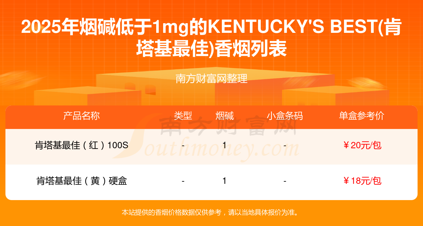 KENTUCKY'S BEST(肯塔基最佳)香煙煙堿低于1mg的煙分別有肯塔基最佳(紅)100S參考價20元/包、肯塔基最佳(黃)硬盒參考價18元/包等。