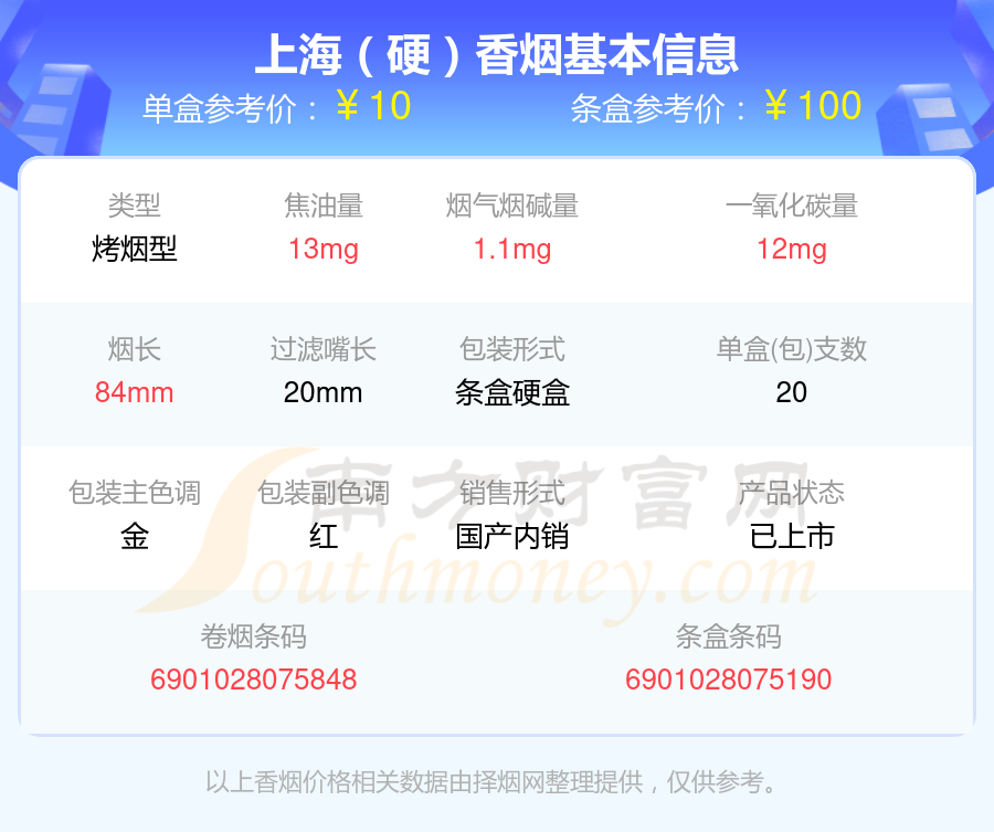 上海香煙煙堿低于5mg的煙有上海(硬)、上海(硬12支)、上海(硬5支)等,詳細(xì)價(jià)格如下: