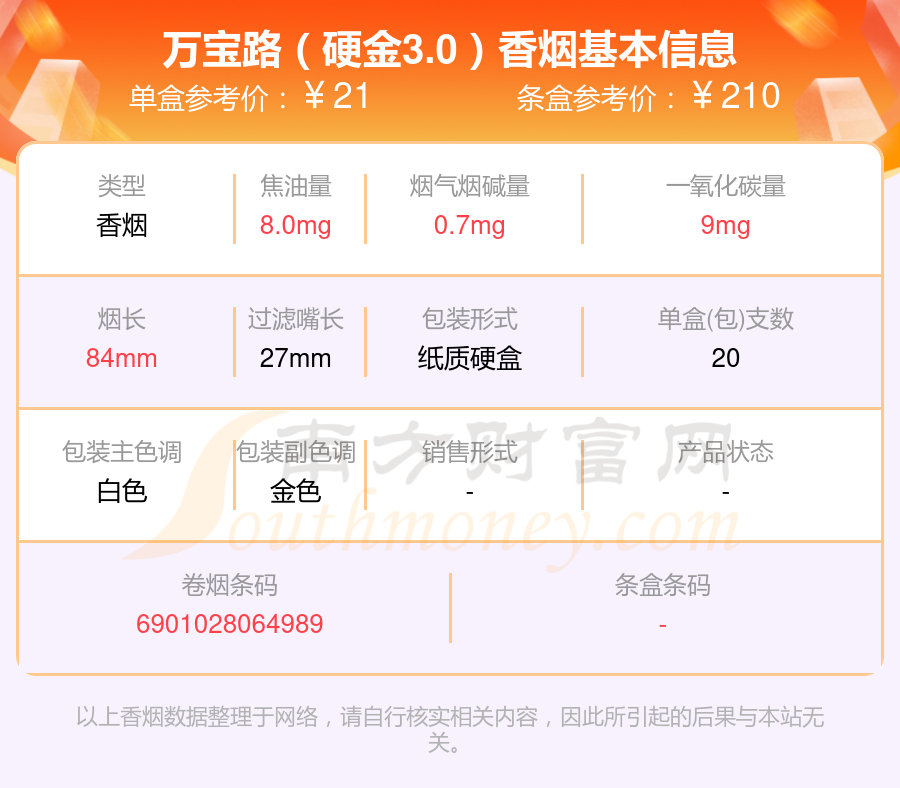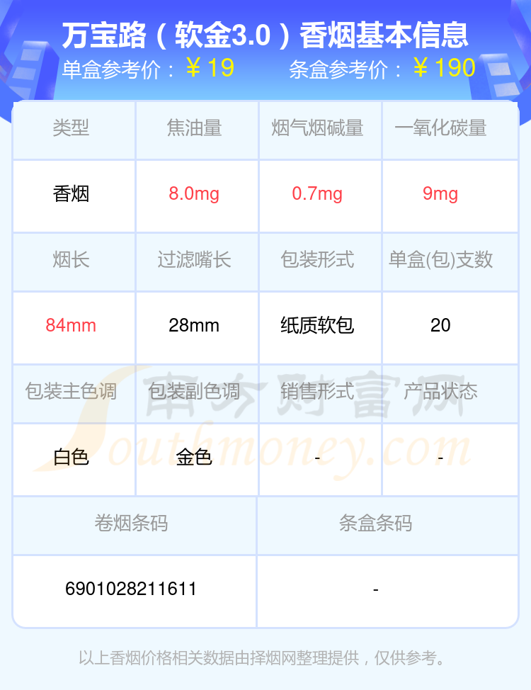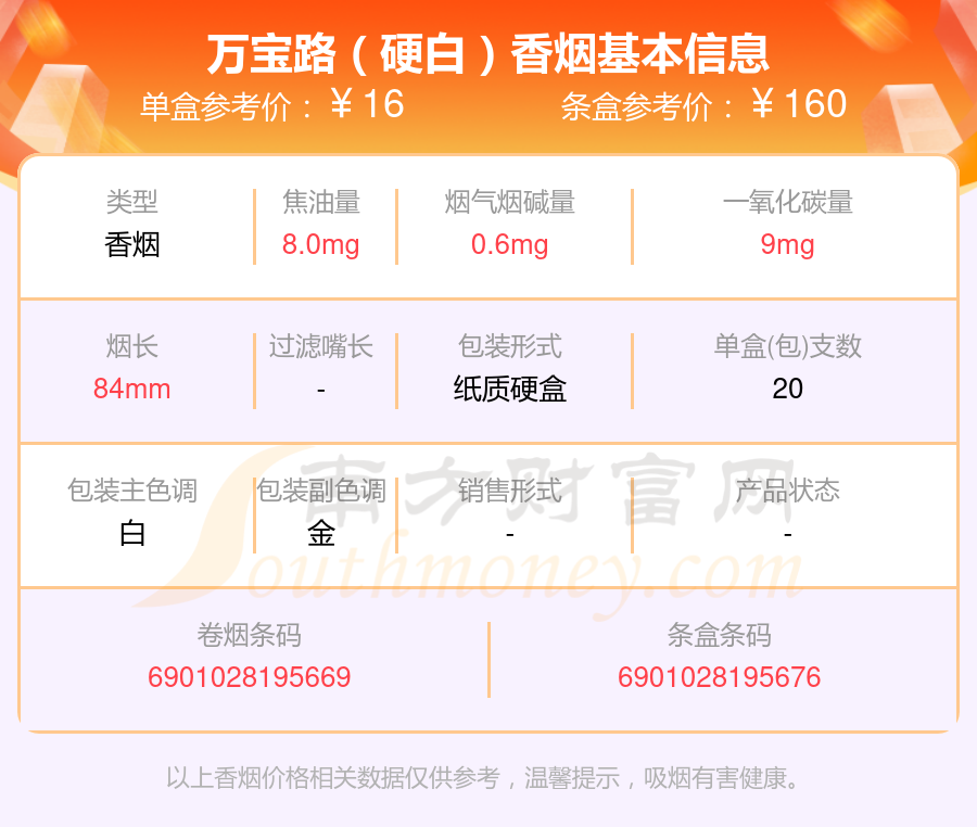 萬(wàn)寶路(硬冰爵)參考價(jià)24.0元/包、萬(wàn)寶路(硬冰爵2.0)參考價(jià)24.0元/包、萬(wàn)寶路(軟白)參考價(jià)15.0元/包、萬(wàn)寶路(硬金)參考價(jià)21.0元/包、萬(wàn)寶路(軟金)參考價(jià)20.0元/包、萬(wàn)寶路(硬白)參考價(jià)16.0元/包、萬(wàn)寶路(軟金3.0)參考價(jià)19.0元/包、萬(wàn)寶路(硬金3.0)參考價(jià)21.0元/包等。