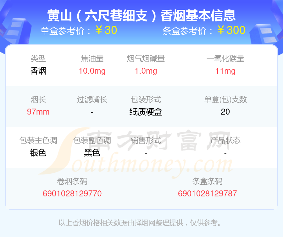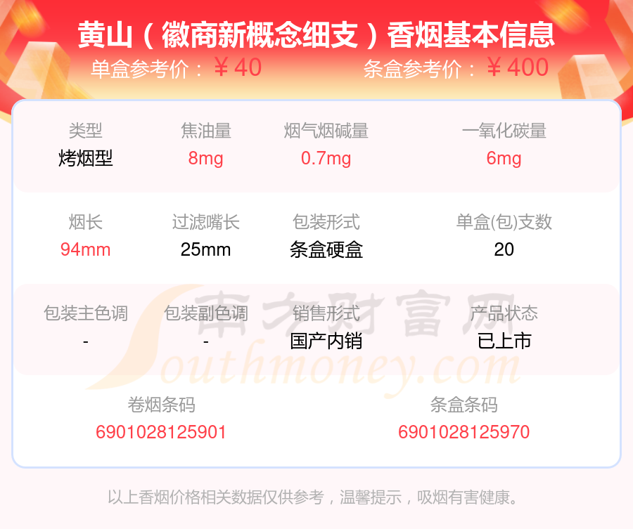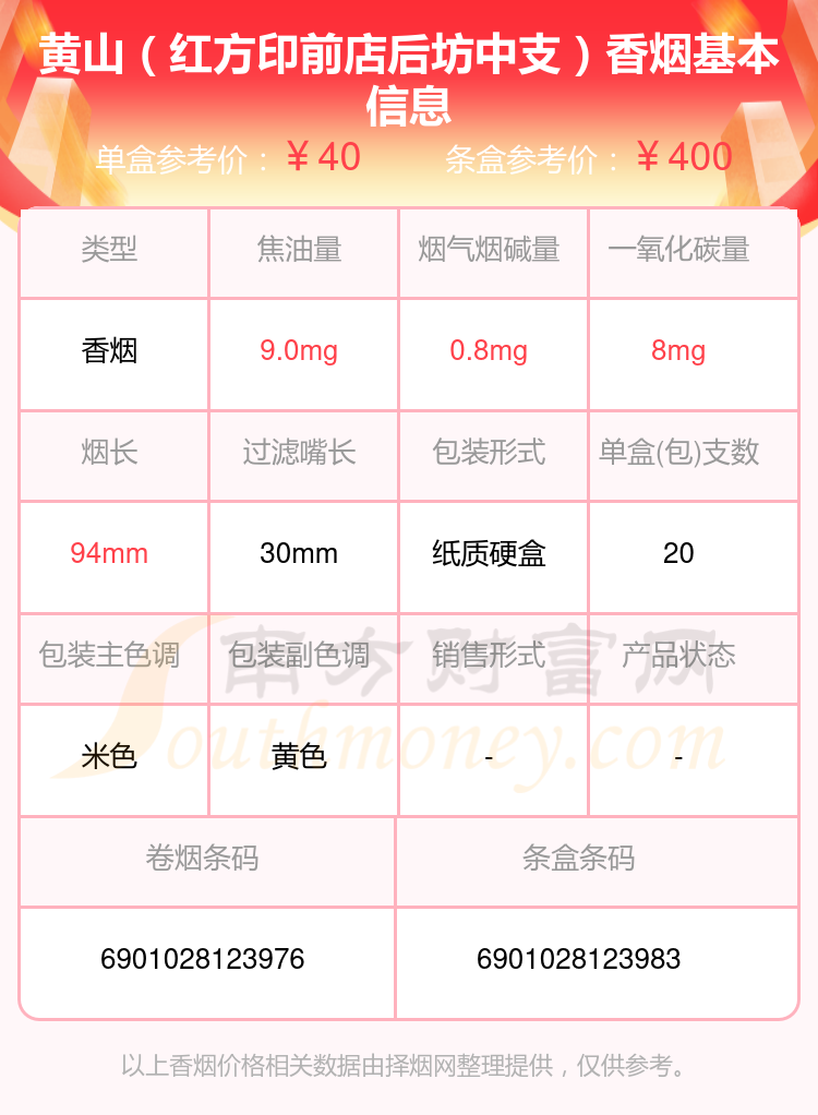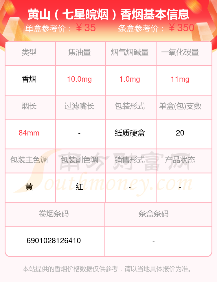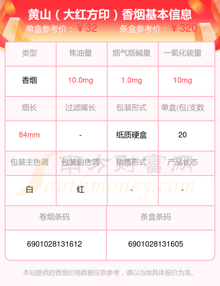 黃山(徽商新概念)參考價(jià)40.0元/包、黃山(紅方印前店后坊中支)參考價(jià)40.0元/包、黃山(徽商新概念細(xì)支)參考價(jià)40元/包、黃山(贏客迎客松)參考價(jià)36.0元/包、黃山(紅方印1755)參考價(jià)35.0元/包、黃山(醉翁亭)參考價(jià)35.0元/包、黃山(七星皖煙)參考價(jià)35.0元/包、黃山(大紅方印)參考價(jià)32.0元/包、黃山(新概念)參考價(jià)32.0元/包、黃山(六尺巷細(xì)支)參考價(jià)30.0元/包等。