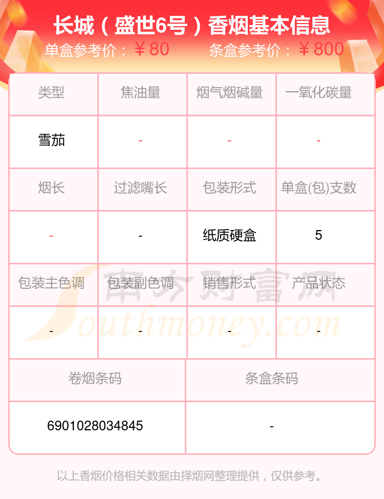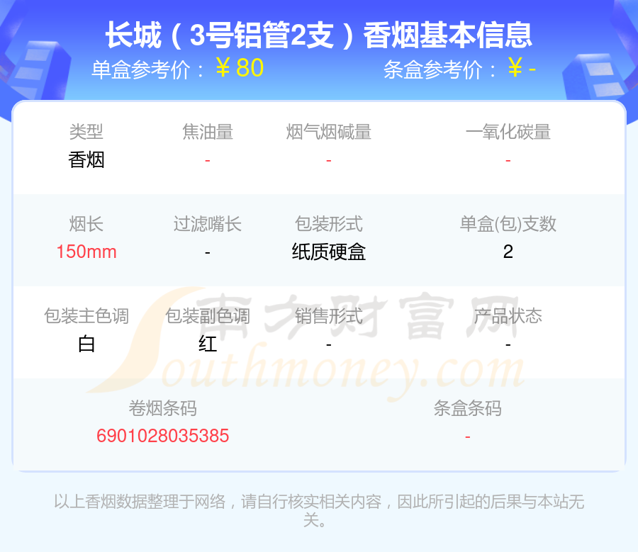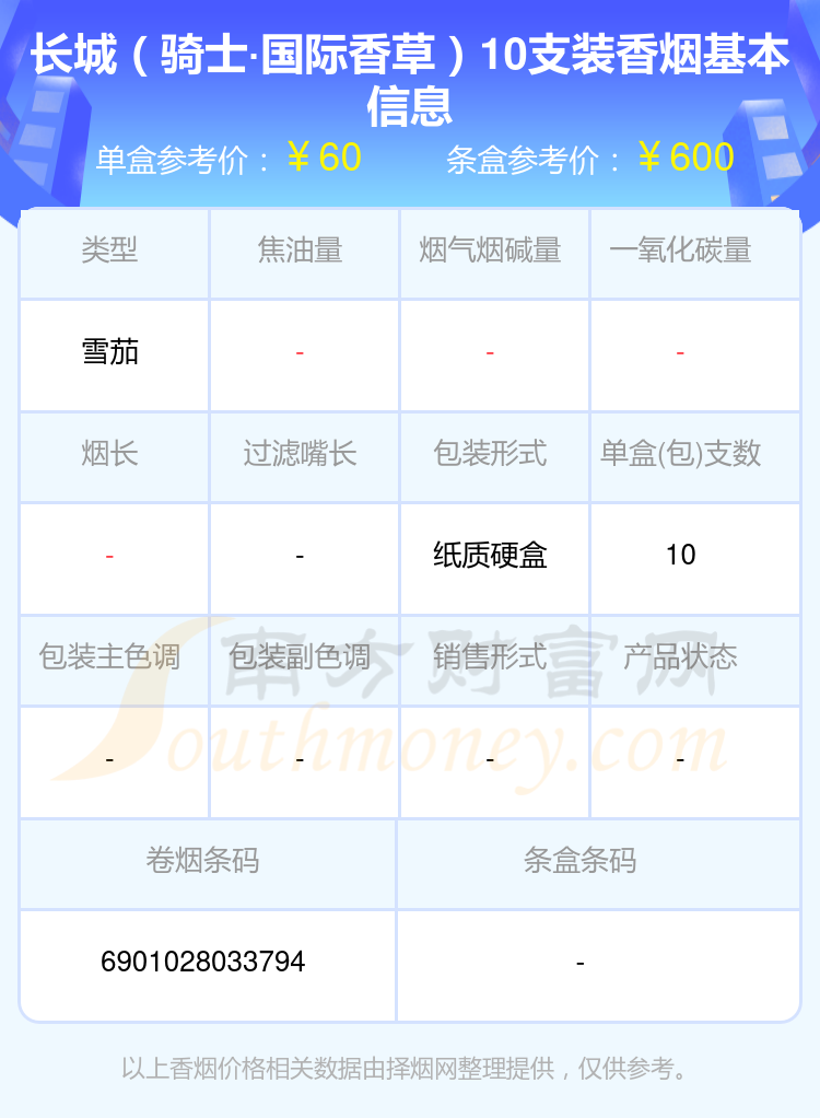 長城(3號鋁管2支)參考價80.0元/包、長城(盛世6號)參考價80.0元/包、長城(騎士·國際香草)10支裝參考價60.0元/包、長城(騎士·國際原味)10支裝參考價60.0元/包、長城(騎士國際原味2號)參考價60元/包等。