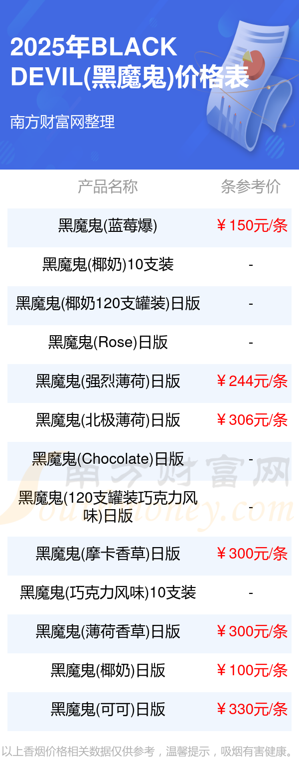 BLACK DEVIL(黑魔鬼)香煙最新價格2025:黑魔鬼(椰奶120支罐裝)日版參考價161.0元/包、黑魔鬼(120支罐裝巧克力風(fēng)味)日版參考價161.0元/包、黑魔鬼(可可)日版參考價33.0元/包、黑魔鬼(北極薄荷)日版參考價31.0元/包、黑魔鬼(摩卡香草)日版參考價30.0元/包、黑魔鬼(薄荷香草)日版參考價30.0元/包、黑魔鬼(強烈薄荷)日版參考價24.4元/包、黑魔鬼(巧克力風(fēng)味)10支裝參考價15.0元/包。