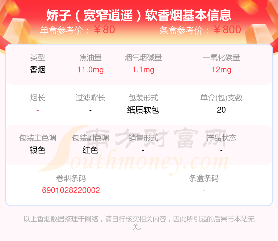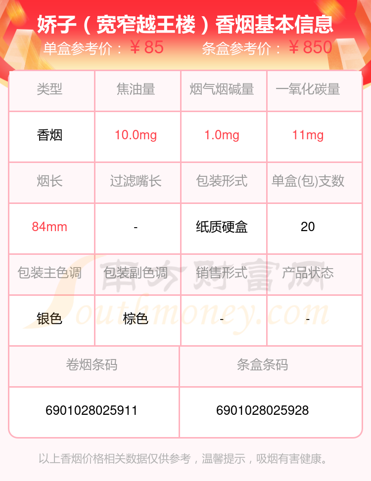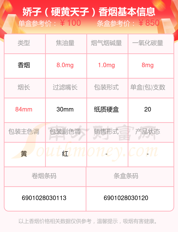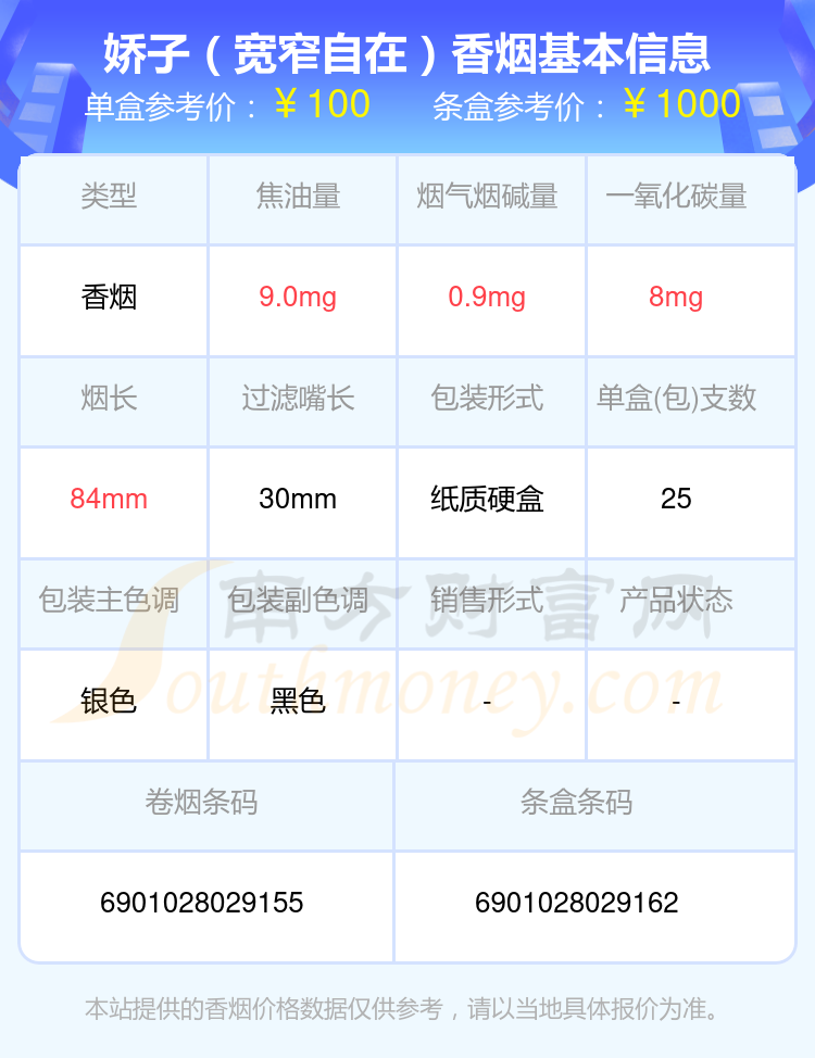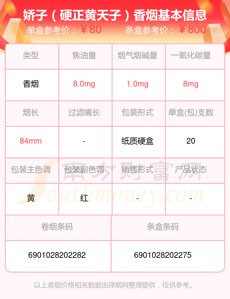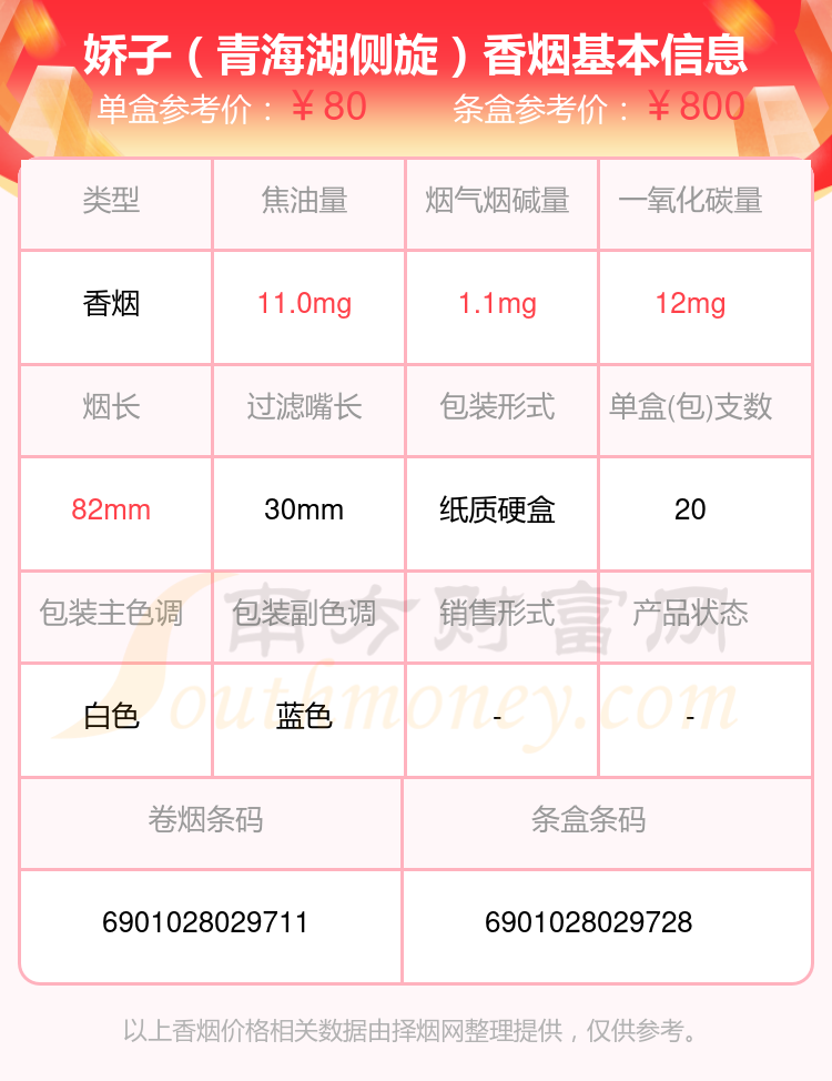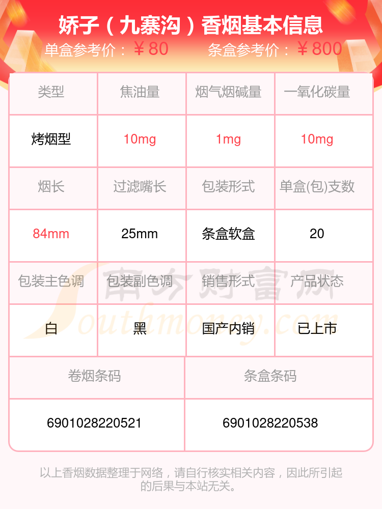 嬌子(紅韻)參考價90.0元/包、嬌子(寬窄越王樓)參考價85.0元/包、嬌子(青海湖側旋)參考價80.0元/包、嬌子(寬窄如意保濕版)307參考價80.0元/包、嬌子(硬正黃天子)參考價80.0元/包、嬌子(寬窄逍遙)軟參考價80.0元/包、嬌子(九寨溝)參考價80元/包、嬌子(硬黃天子)參考價100.0元/包、嬌子(龍涎香)參考價100.0元/包、嬌子(寬窄自在)參考價100.0元/包等。