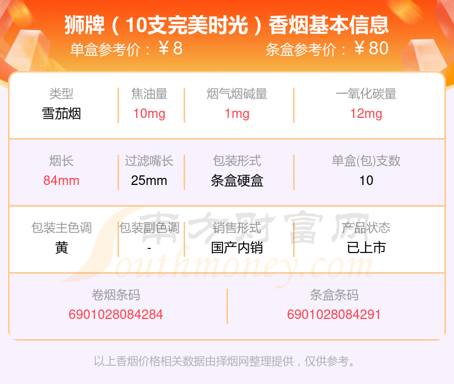 獅牌(10支完美時光)條盒參考價:80元