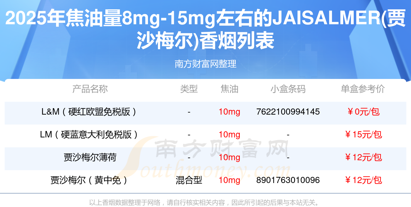焦油量8mg-15mg左右的JAISALMER(賈沙梅爾)香煙有哪些?擇煙網(wǎng)為大家整理盤點,有L&M(硬紅歐盟免稅版)、LM(硬藍意大利免稅版)、賈沙梅爾薄荷、賈沙梅爾(黃中免)等,詳細價格如下: