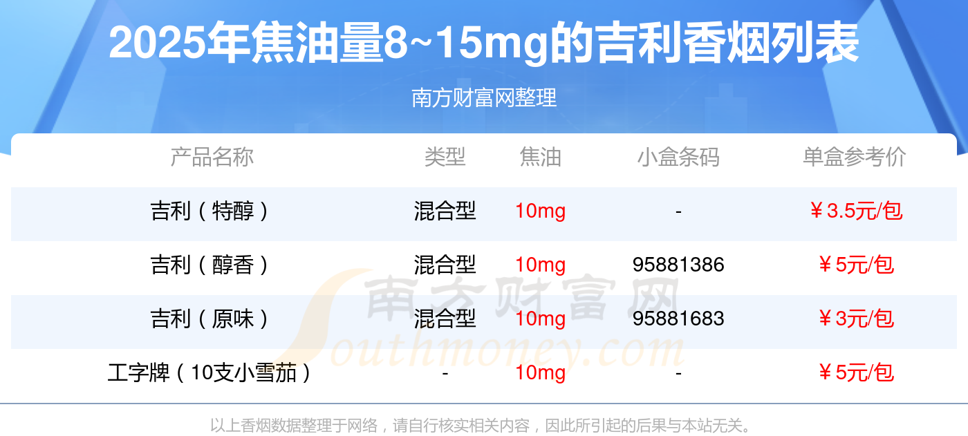 吉利香煙焦油量8~15mg的煙有吉利(特醇)、吉利(醇香)、吉利(原味)、工字牌(10支小雪茄)等,詳細(xì)價(jià)格如下:
