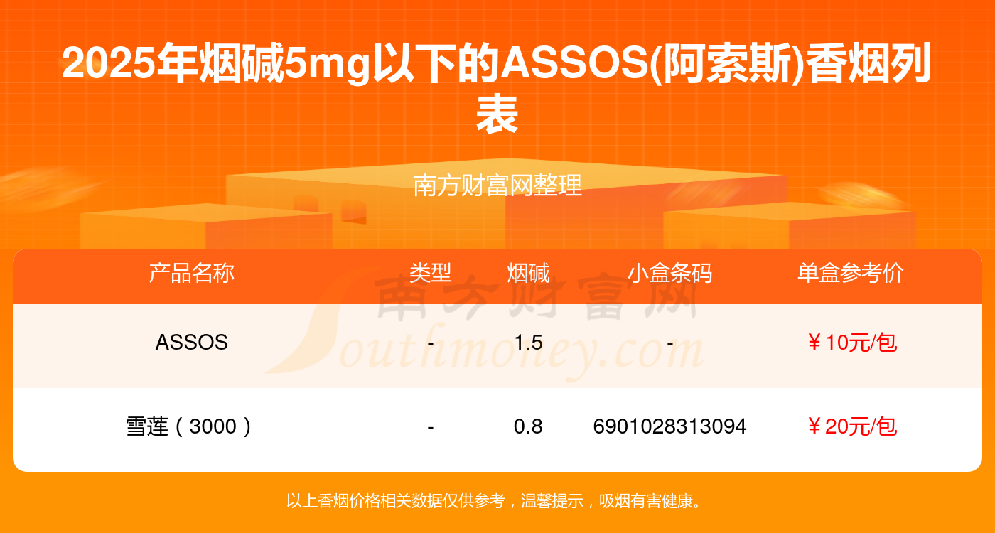 ASSOS(阿索斯)香煙煙堿5mg以下的有哪些?擇煙網(wǎng)為大家整理提供,分別有:
