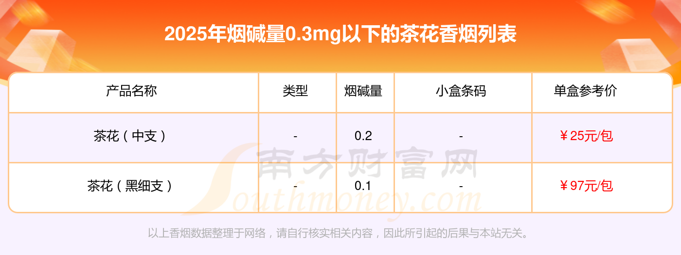 擇煙網(wǎng)為大家盤點(diǎn)了煙堿量0.3mg以下的茶花香煙,有茶花(中支)、茶花(黑細(xì)支)等,詳細(xì)價(jià)格如下: