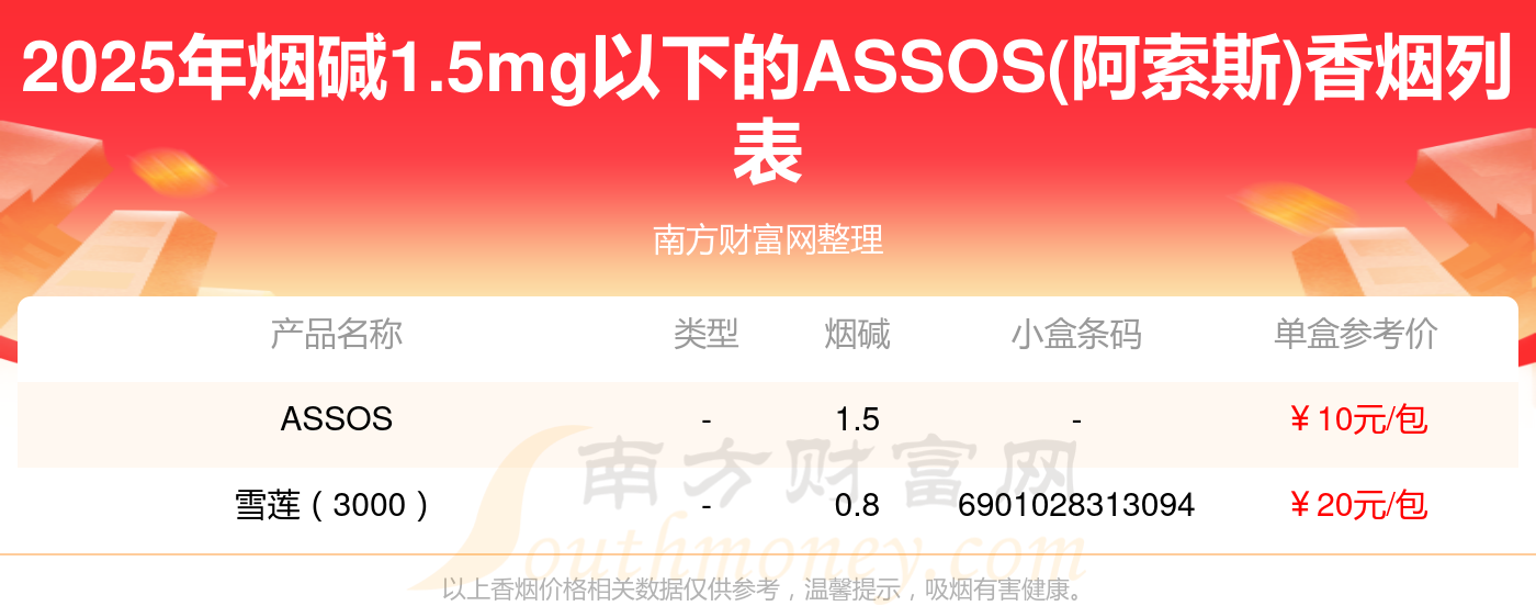 擇煙網(wǎng)為大家盤點(diǎn)了煙堿1.5mg以下的ASSOS(阿索斯)香煙,分別有ASSOS、雪蓮(3000)等,具體價(jià)格如下: