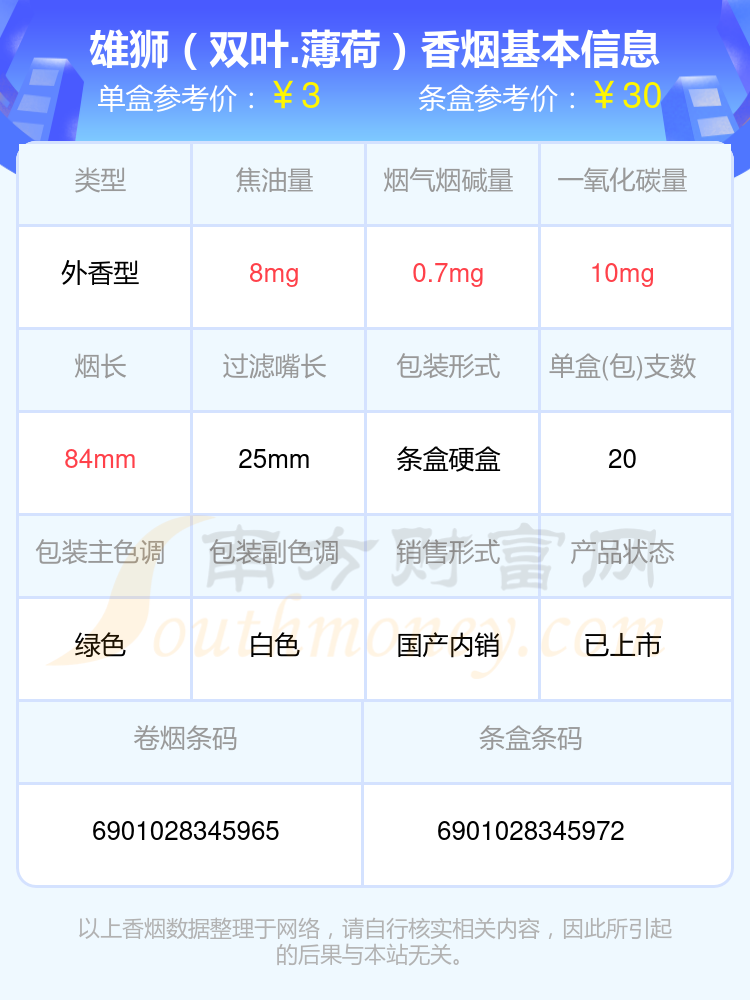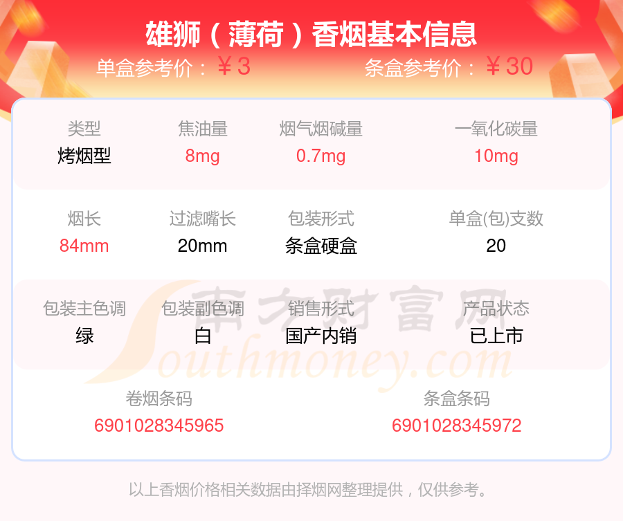 雄獅(紅)參考價(jià)2元/包、雄獅(紅老版)參考價(jià)5元/包、雄獅(雙葉.薄荷)參考價(jià)3元/包、雄獅(硬)參考價(jià)3元/包、雄獅(薄荷)參考價(jià)3元/包、雄獅(吉祥)參考價(jià)10元/包、雄獅(007)參考價(jià)7元/包、雄獅(新)參考價(jià)5元/包等。