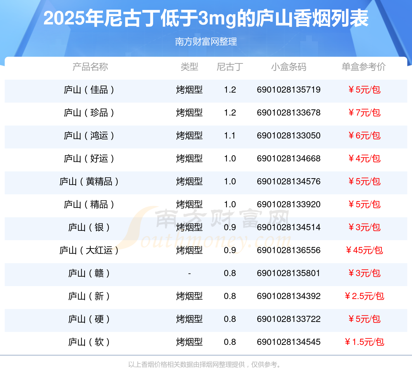 擇煙網(wǎng)為大家盤點(diǎn)了尼古丁低于3mg的廬山香煙,有以下這些: