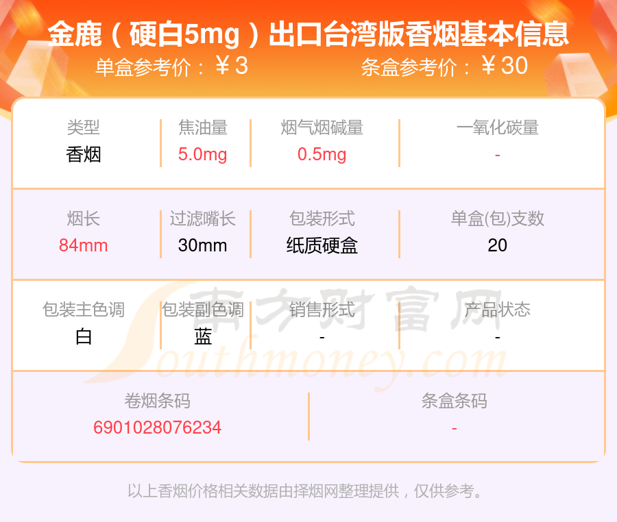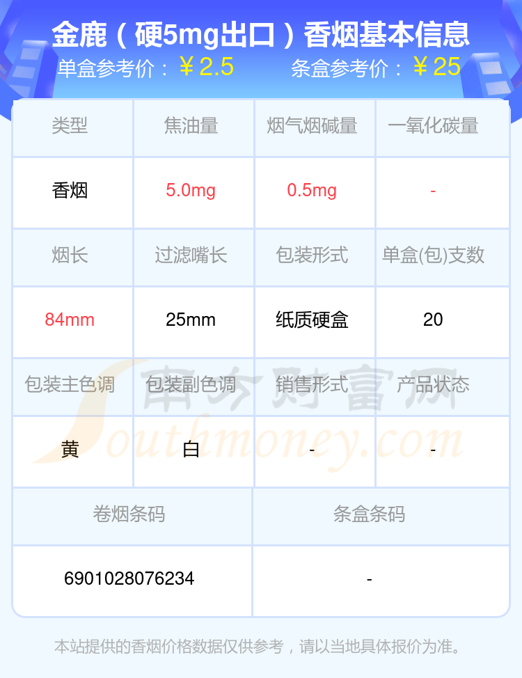 金鹿香煙尼古丁量0.5mg以下的煙有金鹿(硬白5mg)出口臺(tái)灣版、金鹿(硬5mg出口)等,詳細(xì)價(jià)格如下: