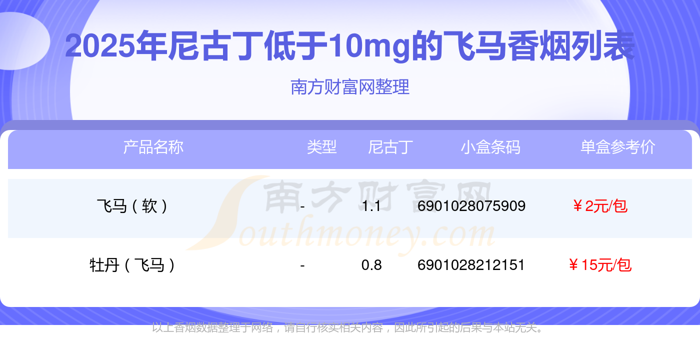 擇煙網(wǎng)為大家盤點(diǎn)了尼古丁低于10mg的飛馬香煙,分別有飛馬(軟)、牡丹(飛馬)等,具體價(jià)格如下: