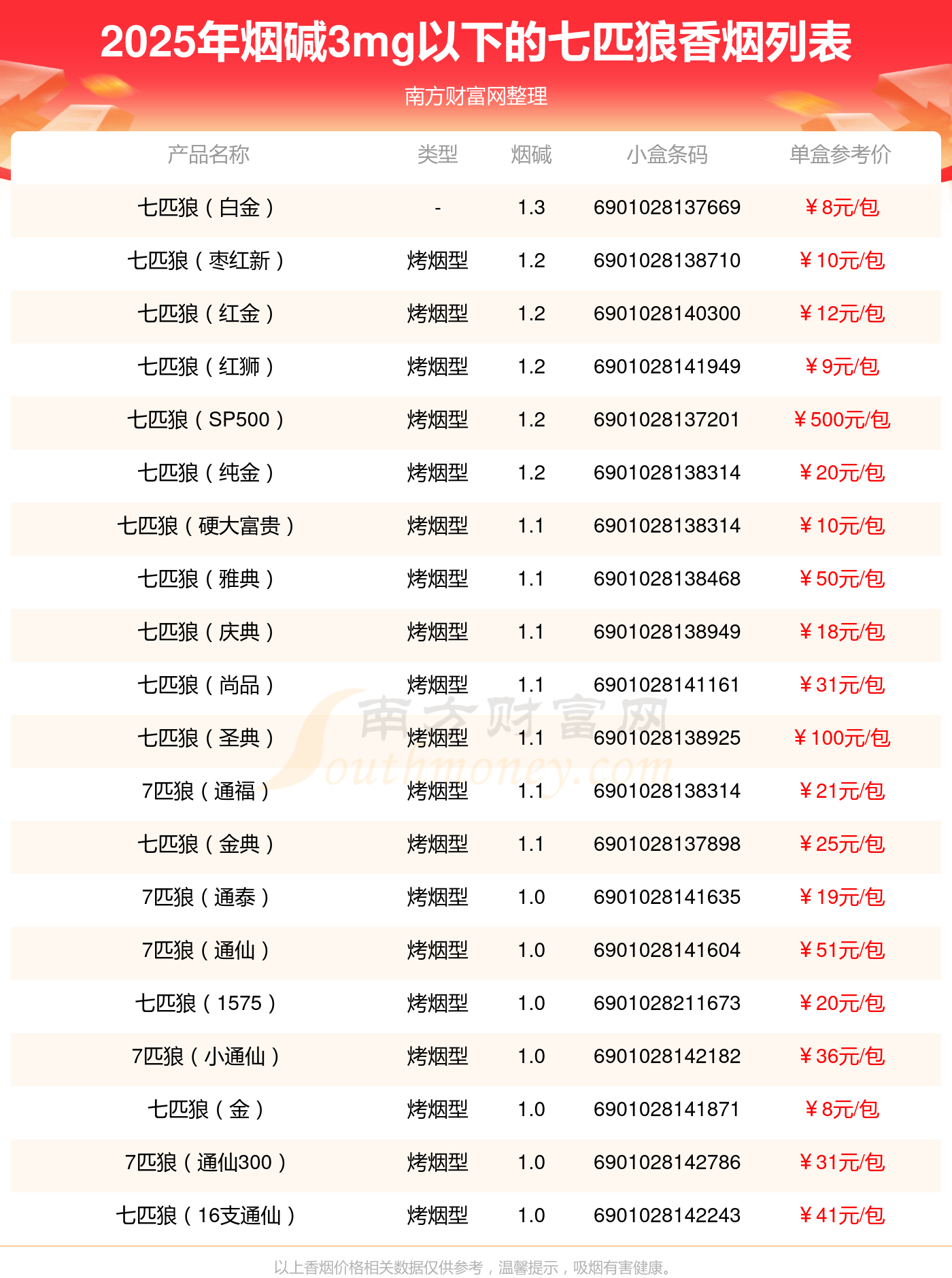 七匹狼(白金)參考價(jià)8元/包、七匹狼(棗紅新)參考價(jià)10.0元/包、七匹狼(紅金)參考價(jià)12.0元/包、七匹狼(紅獅)參考價(jià)9.0元/包、七匹狼(SP500)參考價(jià)500.0元/包、七匹狼(純金)參考價(jià)20.0元/包、七匹狼(硬大富貴)參考價(jià)10元/包、七匹狼(雅典)參考價(jià)50.0元/包、七匹狼(慶典)參考價(jià)18.0元/包、七匹狼(尚品)參考價(jià)31.0元/包等。
