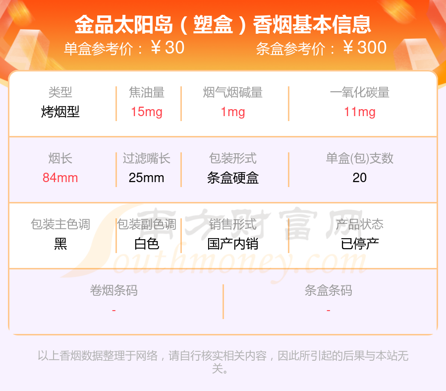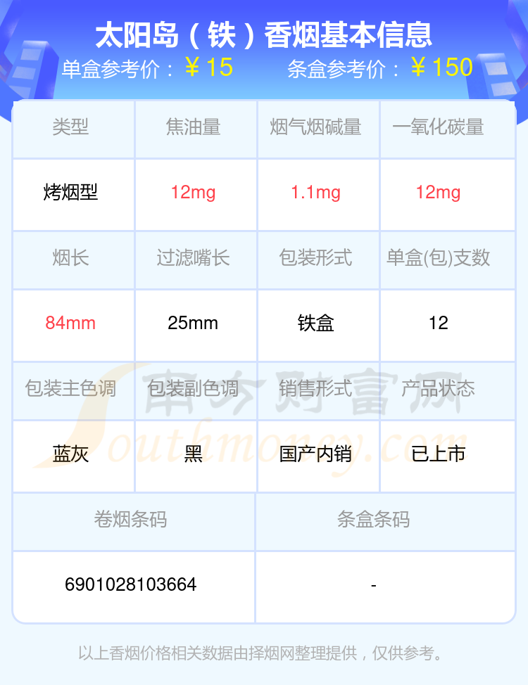 擇煙網(wǎng)為大家盤點(diǎn)了尼古丁1至2mg左右的太陽島香煙,有太陽島(鐵)、金品太陽島(塑盒)等,詳細(xì)價(jià)格如下: