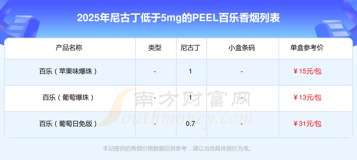 PEEL百樂香煙尼古丁低于5mg的煙分別有百樂(蘋果味爆珠)參考價15元/包、百樂(葡萄爆珠)參考價13元/包、百樂(葡萄日免版)參考價31元/包等。
