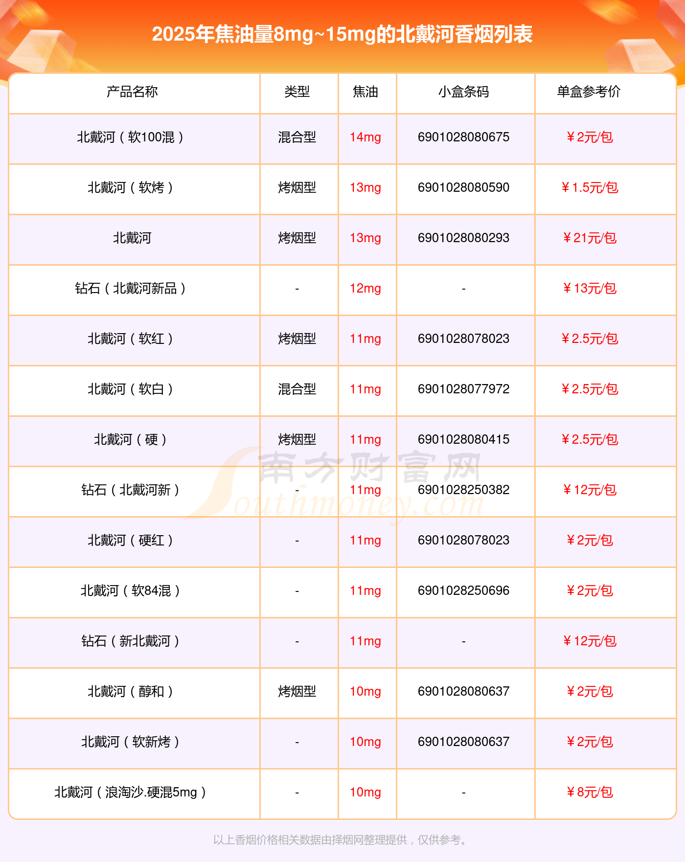 焦油量8mg~15mg的北戴河香煙有哪些?擇煙網(wǎng)為大家整理盤點(diǎn),分別有:北戴河(軟100混)、北戴河(軟烤)、北戴河、鉆石(北戴河新品)、北戴河(軟紅)、北戴河(軟白)、北戴河(硬)、鉆石(北戴河新)、北戴河(硬紅)、北戴河(軟84混)等,具體價格如下: