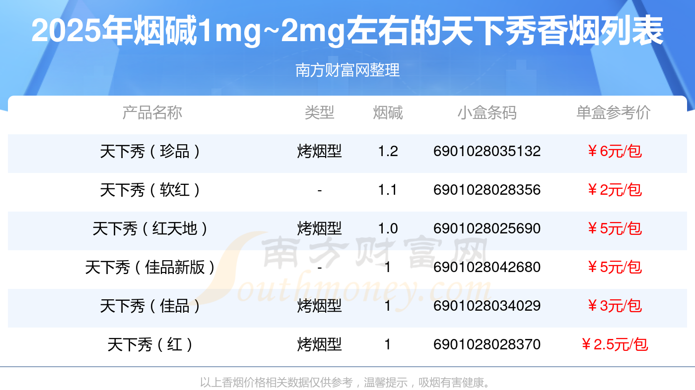 天下秀香煙煙堿1mg~2mg左右的煙有天下秀(珍品)、天下秀(軟紅)、天下秀(紅天地)、天下秀(佳品新版)、天下秀(佳品)、天下秀(紅)等,詳細(xì)價格如下: