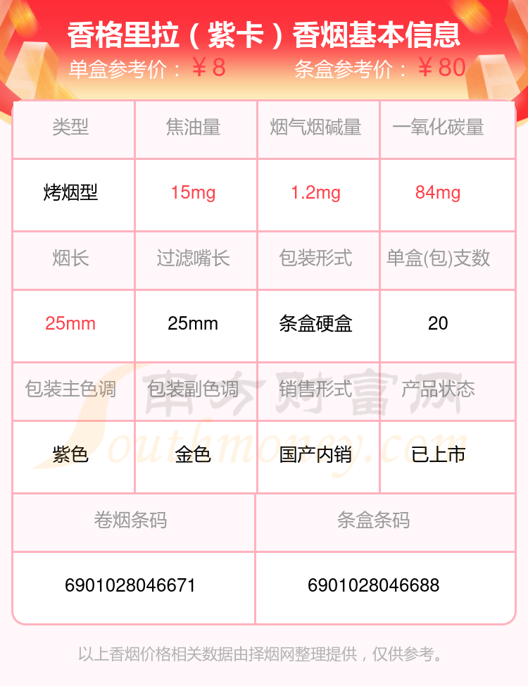 香格里拉香煙焦油量超過15mg的煙有香格里拉(紫月)、香格里拉(紫卡)等,具體價格如下: