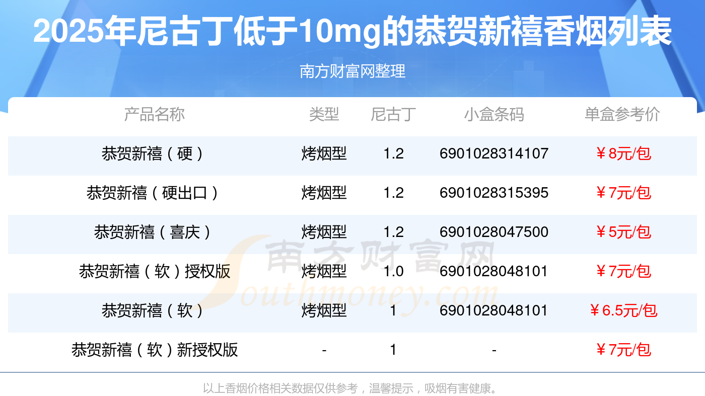 擇煙網(wǎng)為大家盤點(diǎn)了尼古丁低于10mg的恭賀新禧香煙,有以下這些: