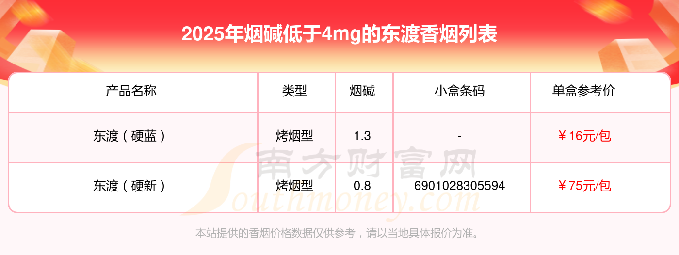 東渡香煙煙堿低于4mg的煙有哪些?擇煙網(wǎng)為大家整理提供,分別有:東渡(硬藍(lán))、東渡(硬新)等,具體價格如下: