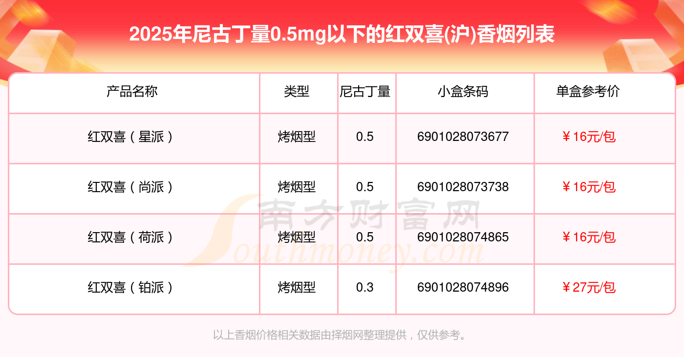 擇煙網(wǎng)為大家盤(pán)點(diǎn)了紅雙喜(滬)香煙尼古丁量0.5mg以下的,分別有紅雙喜(星派)、紅雙喜(尚派)、紅雙喜(荷派)、紅雙喜(鉑派)等,具體價(jià)格如下:
